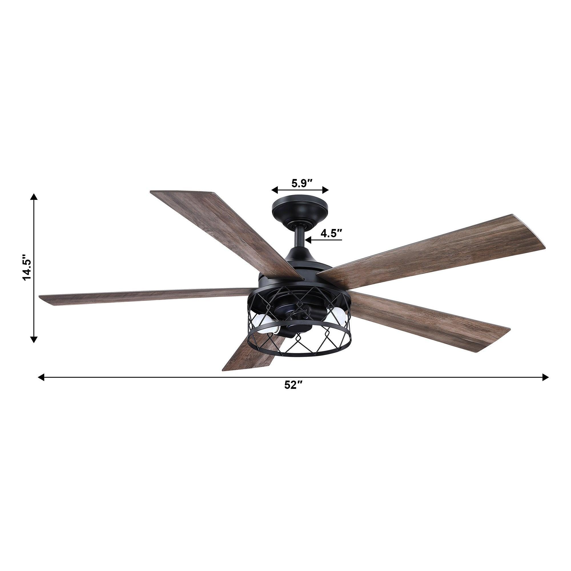 Enhance your living space with this stylish, industrial-style 52" indoor black ceiling fan. Besides its unique decorative cage light kit that enhances your space, it also features five two-color fan blades that perfectly match your room design. Included is a handheld remote that controls the six-speed motor, offering optimal convenience. The light kit, however, uses two E26 light bases and up to a 5w bulb (not included), therefore illuminating your space while also limiting energy consumption.