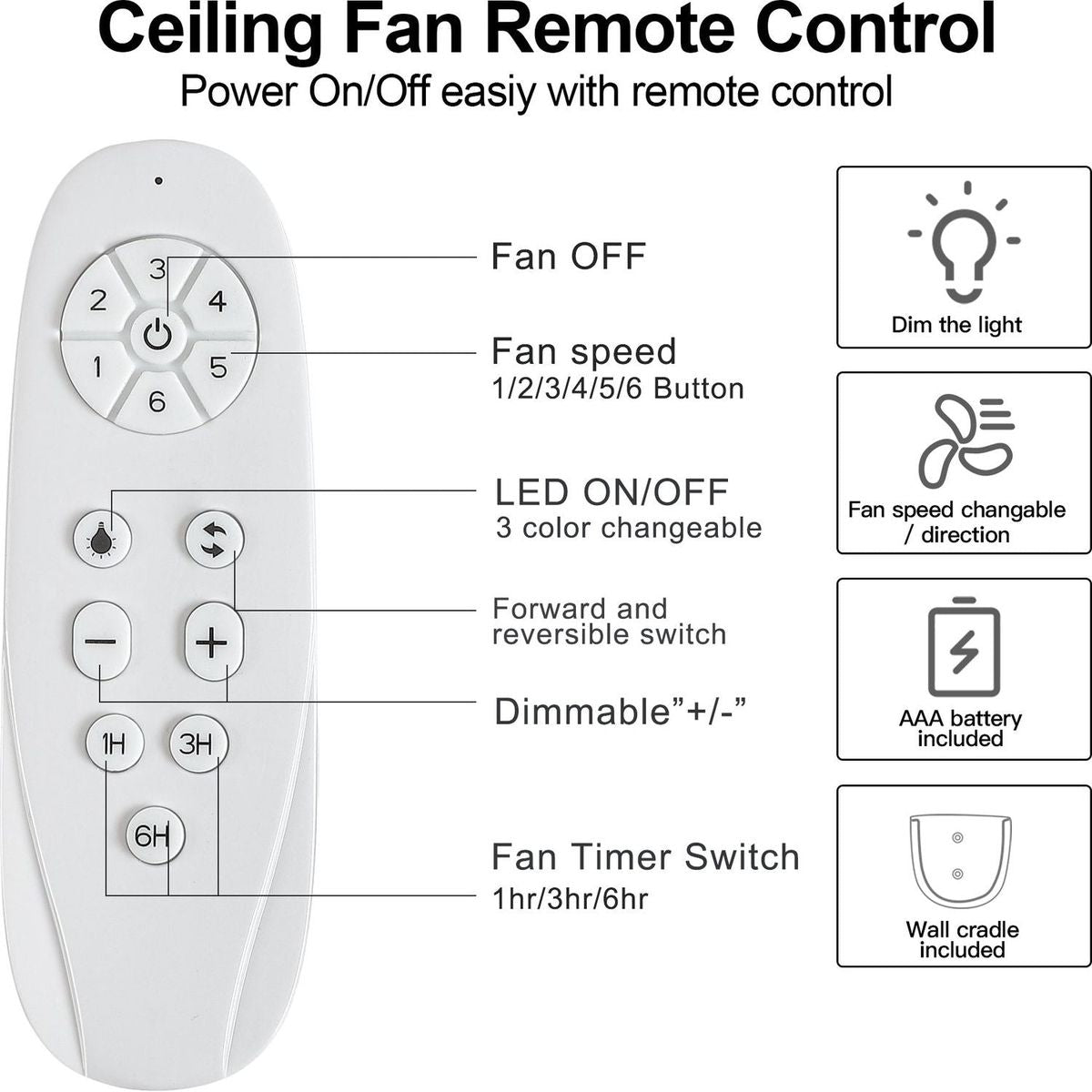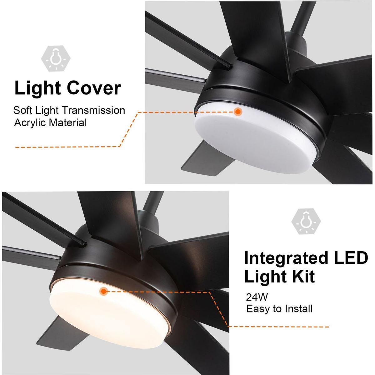 There are six wind speed option could be adjusted, and there are three option for light color: natural light, warm Light and cold light.And especially, the light color could be adjusted into darker or brighter under each light color.