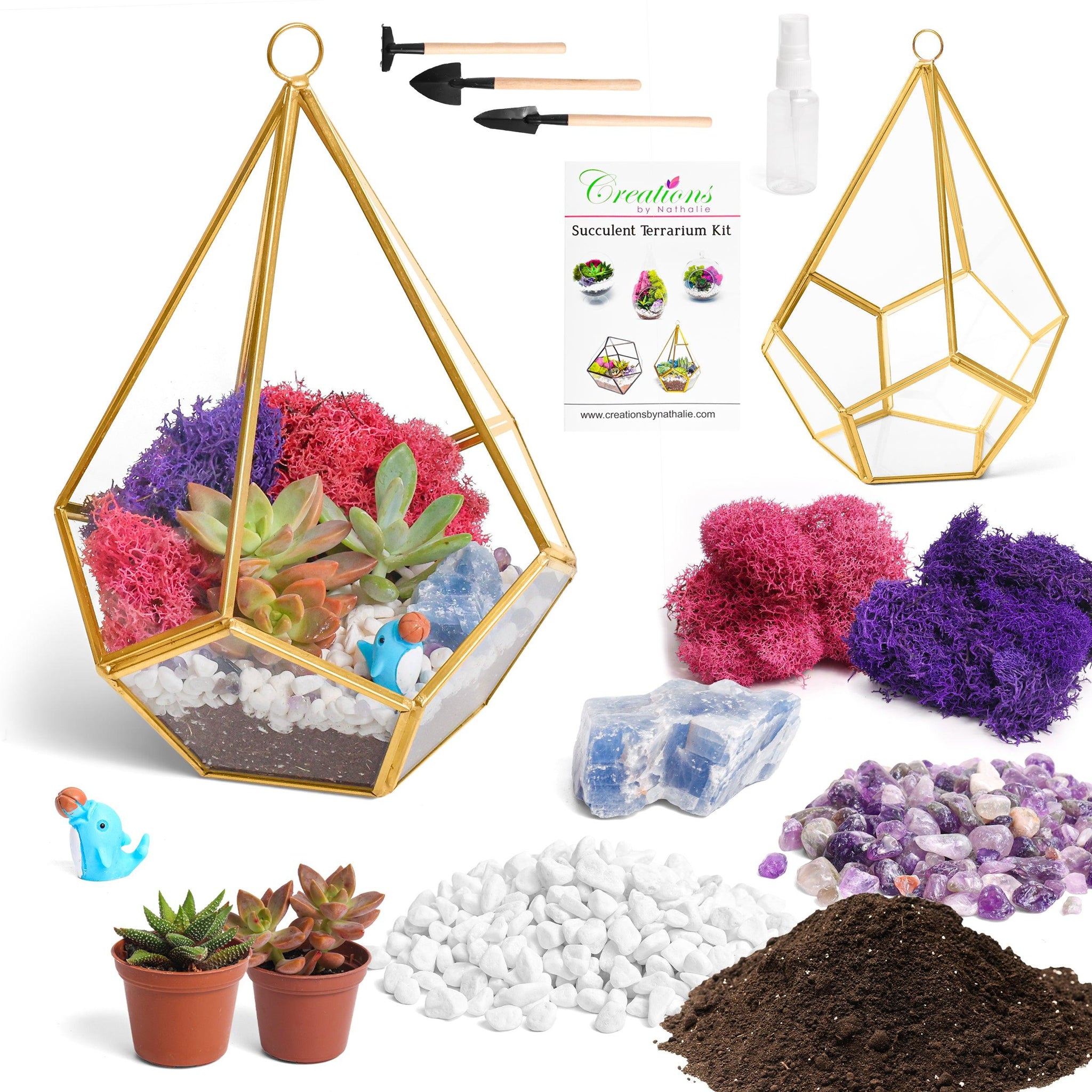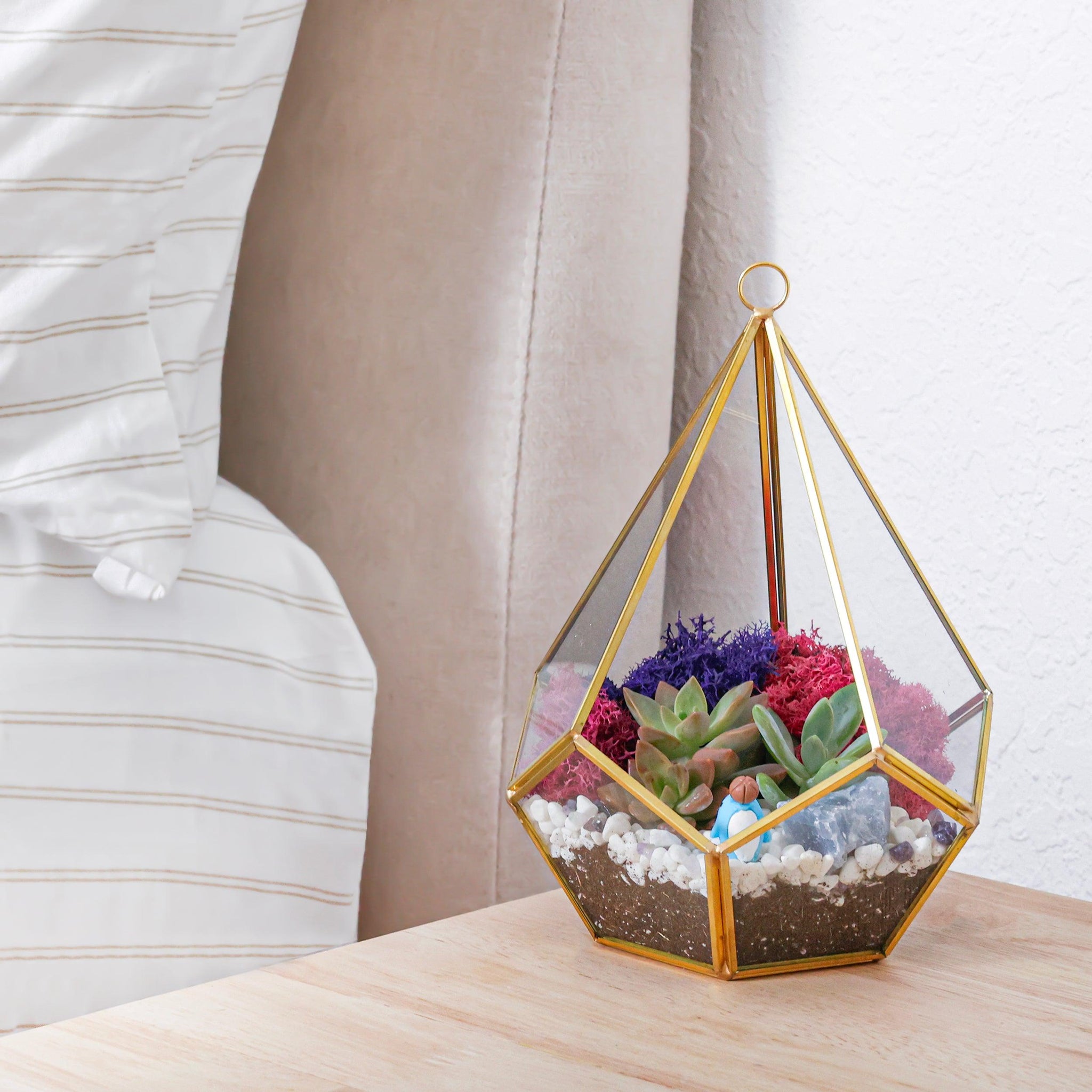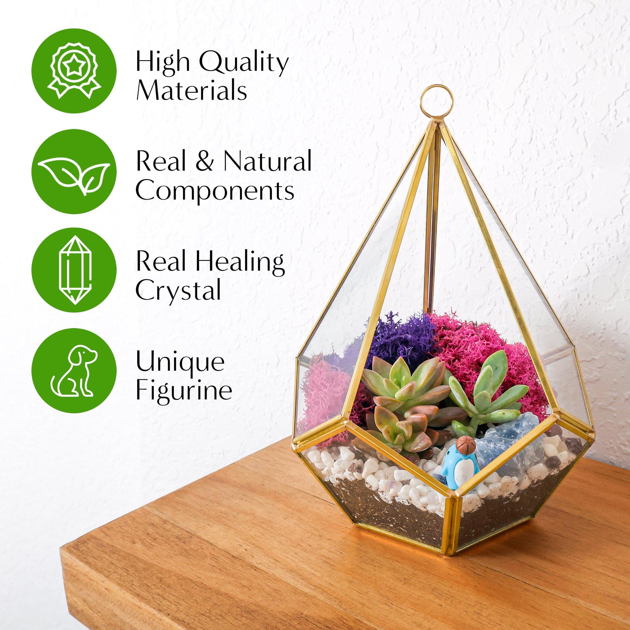 This live DIY Succulent Terrarium Kit includes a unique Geometric Glass, Succulents, Rocks, Crystals and Moss. Everything needed to make your very own succulent terrarium. Terrariums make for create decor at home or even at work. All of our terrariums are perfect size to accent any window or patio table.