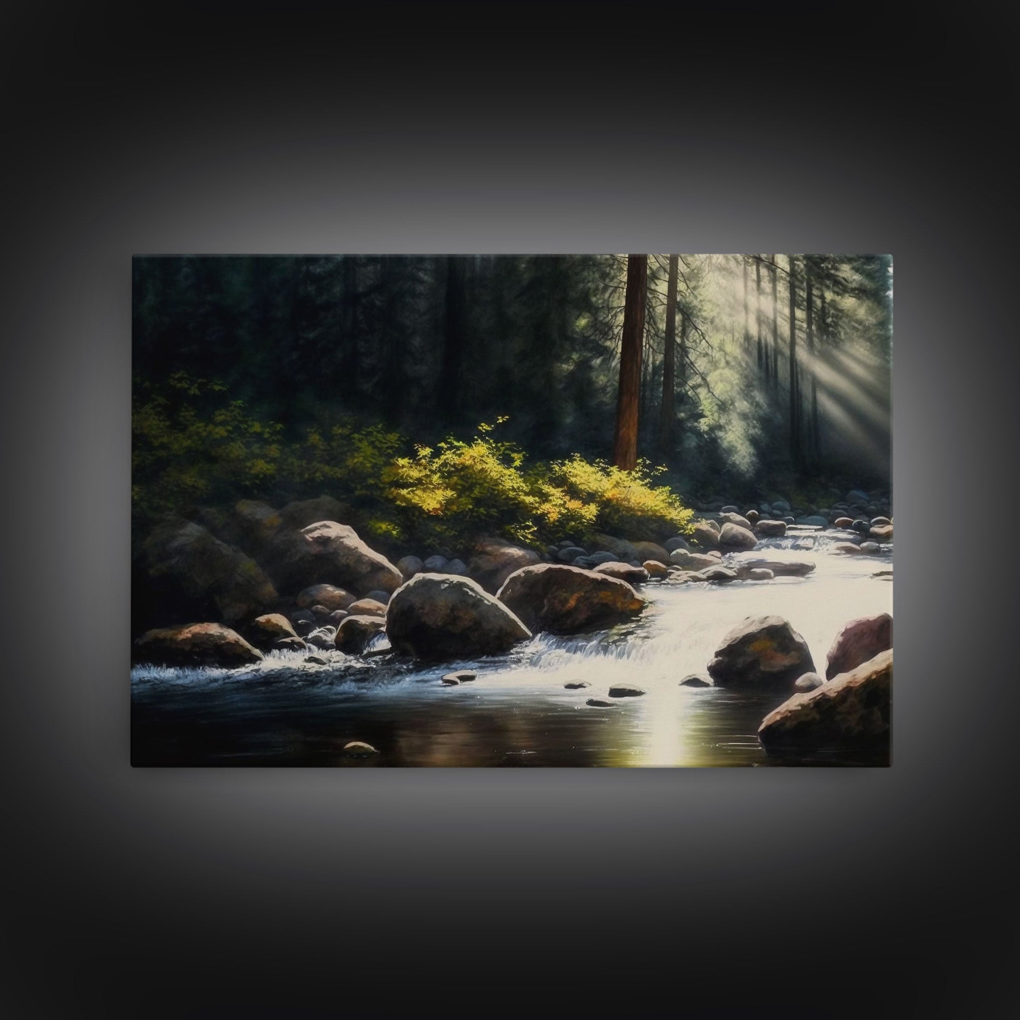 A Rocky Stream, Watercolor Art, Serene nature landscape art, framed canvas print, mouth of the river in the morning light wall art