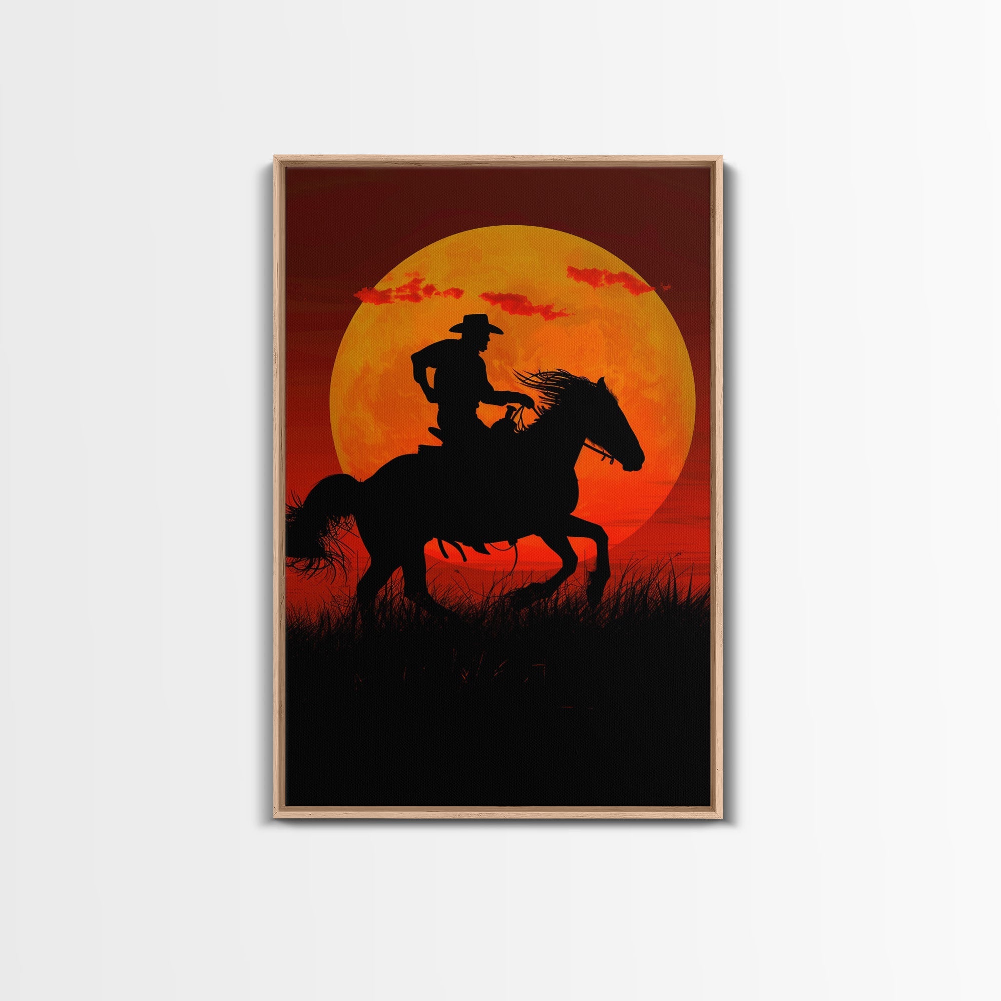 Action Cowboy Silhouette on Horse at Sunset | Framed Canvas Print | Western Wall Art | Dramatic Cowboy Wall Art for Home Decor