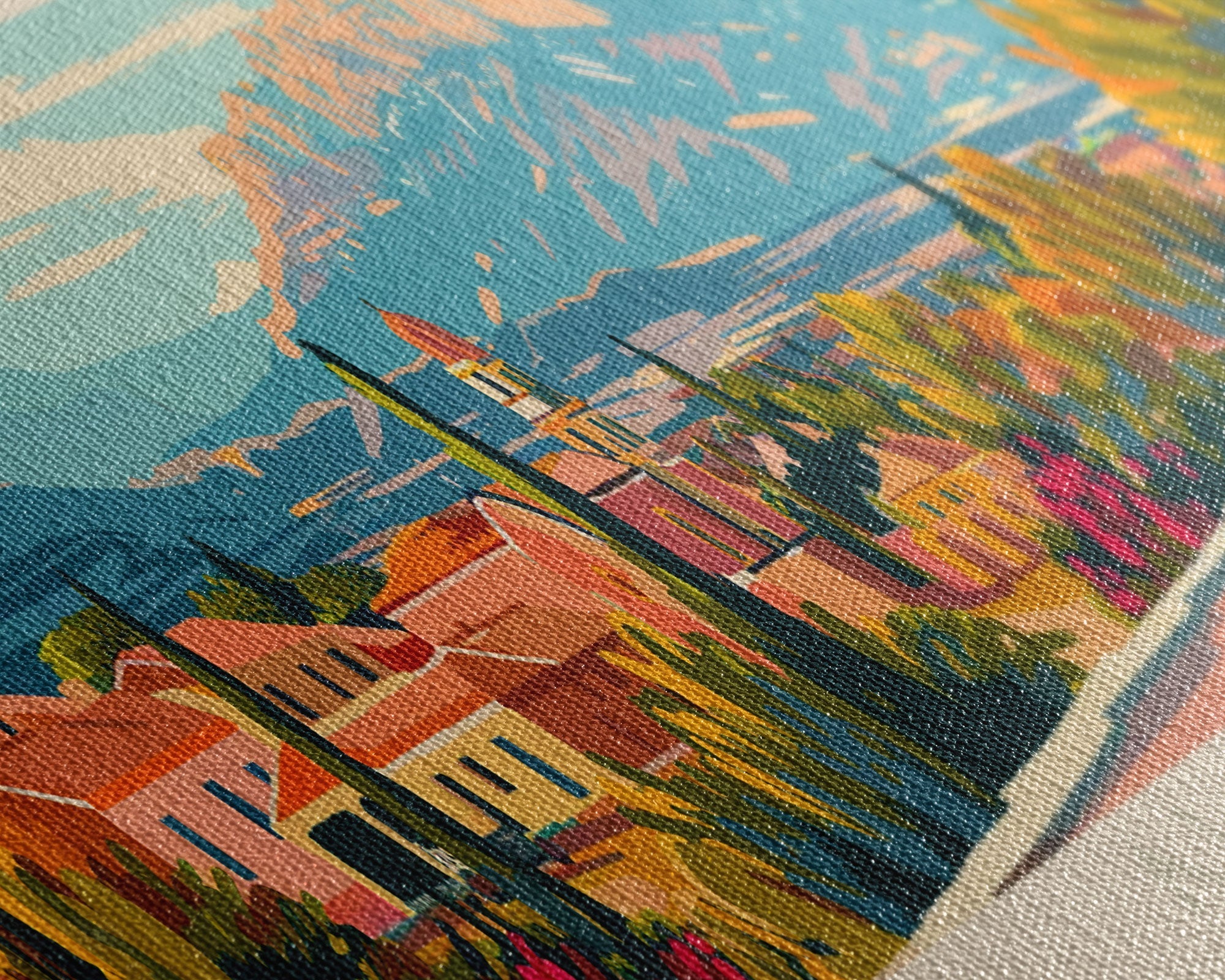 Most of our canvases are made in the USA, with the exception of canvases ordered with the light oak unstained frames, and any large canvases (24x48, 30x60, 16x48 and 20x60) ordered WITH a frame. These are temporarily made in and shipped from Europe, while we try to find a more consistent supplier in the USA.
