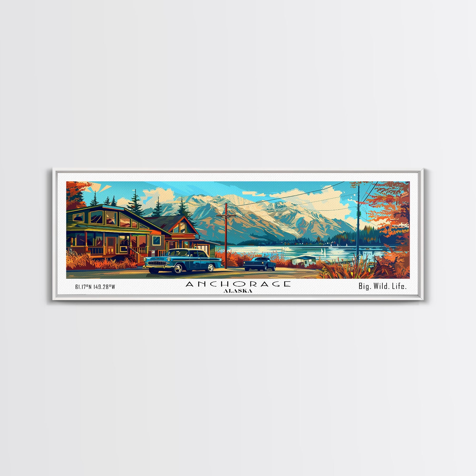 Anchorage Alaska Panoramic Travel Poster Framed Canvas Print, Mid Century Modern Art, Pop Art Style, Wall Art Decor, Home Decoration