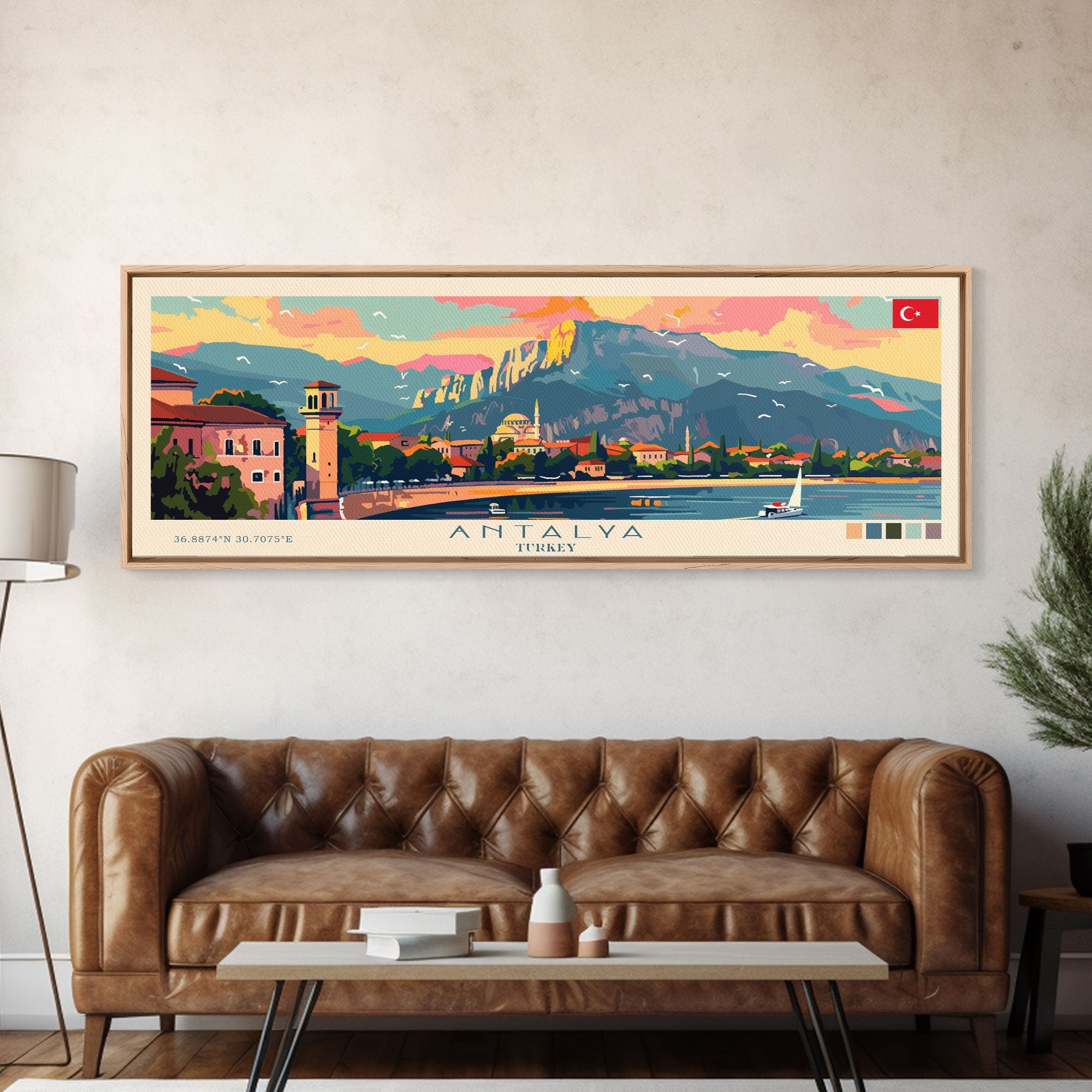 Antalya Turkey Panoramic Travel Poster, Framed Canvas Print or Metal Wall Art, Travel Art, Home Decor, Panoramic Painting, Midcentury Art