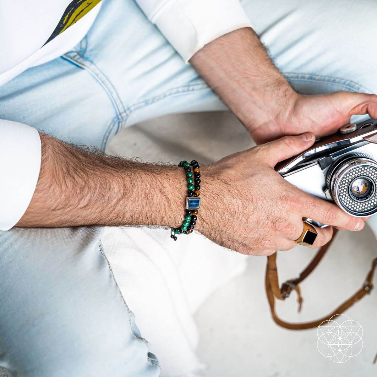 The naturally layered bracelet is equipped with a warrior archetypal rope for an adjustable fit and is adorned with the Flower of Life-inspired Conscious Items logo.