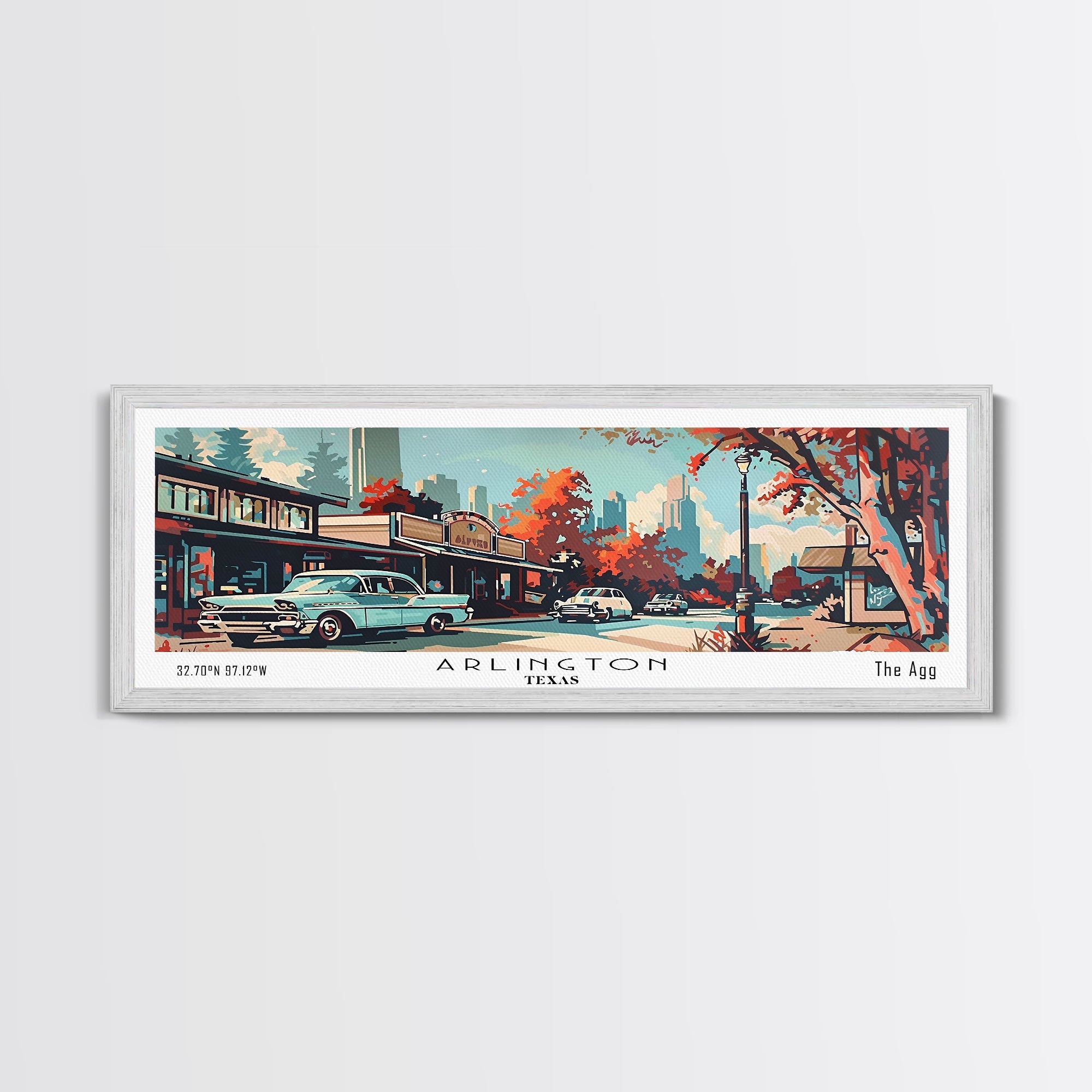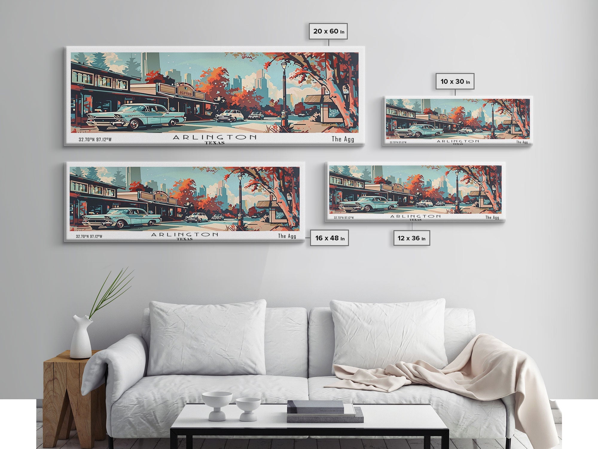 Arlington Texas Panoramic Wall Art, Mid Century Modern Framed Canvas Print, Retro Pop Art Travel Poster, Office Wall Art, Living Room Decor