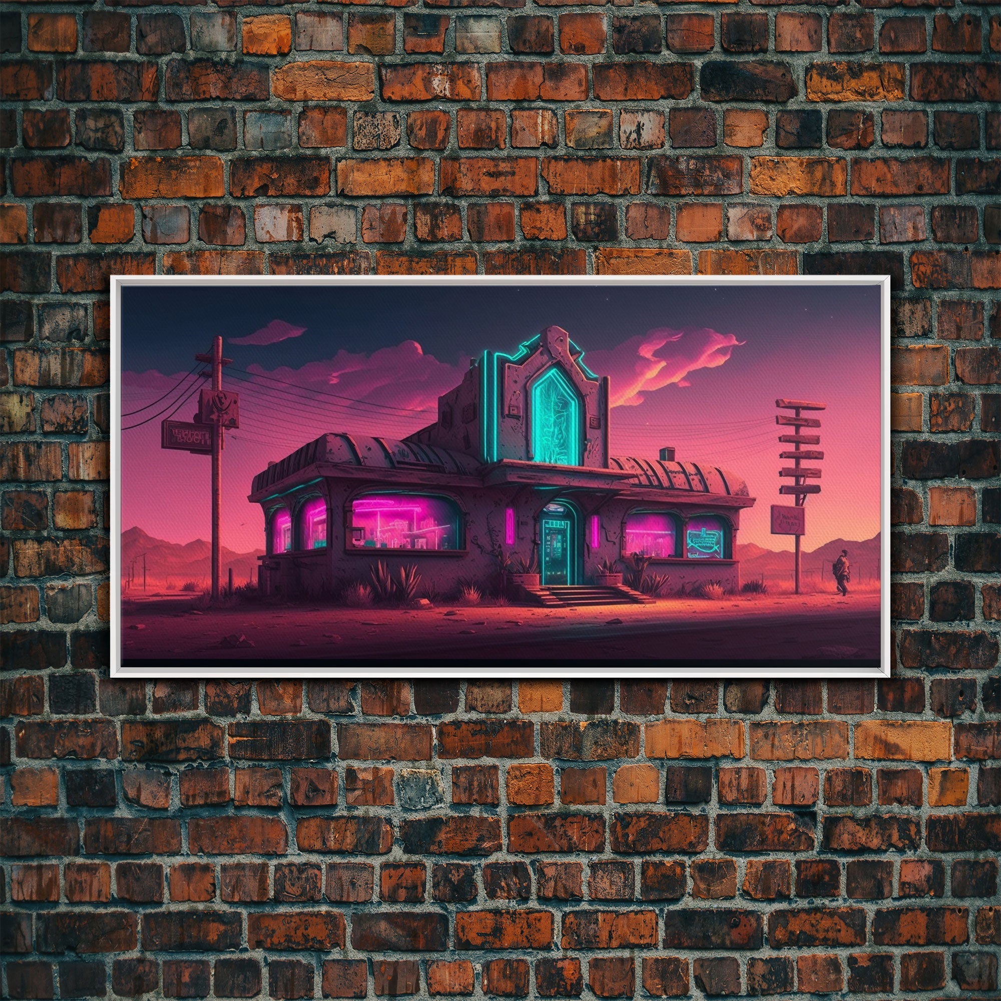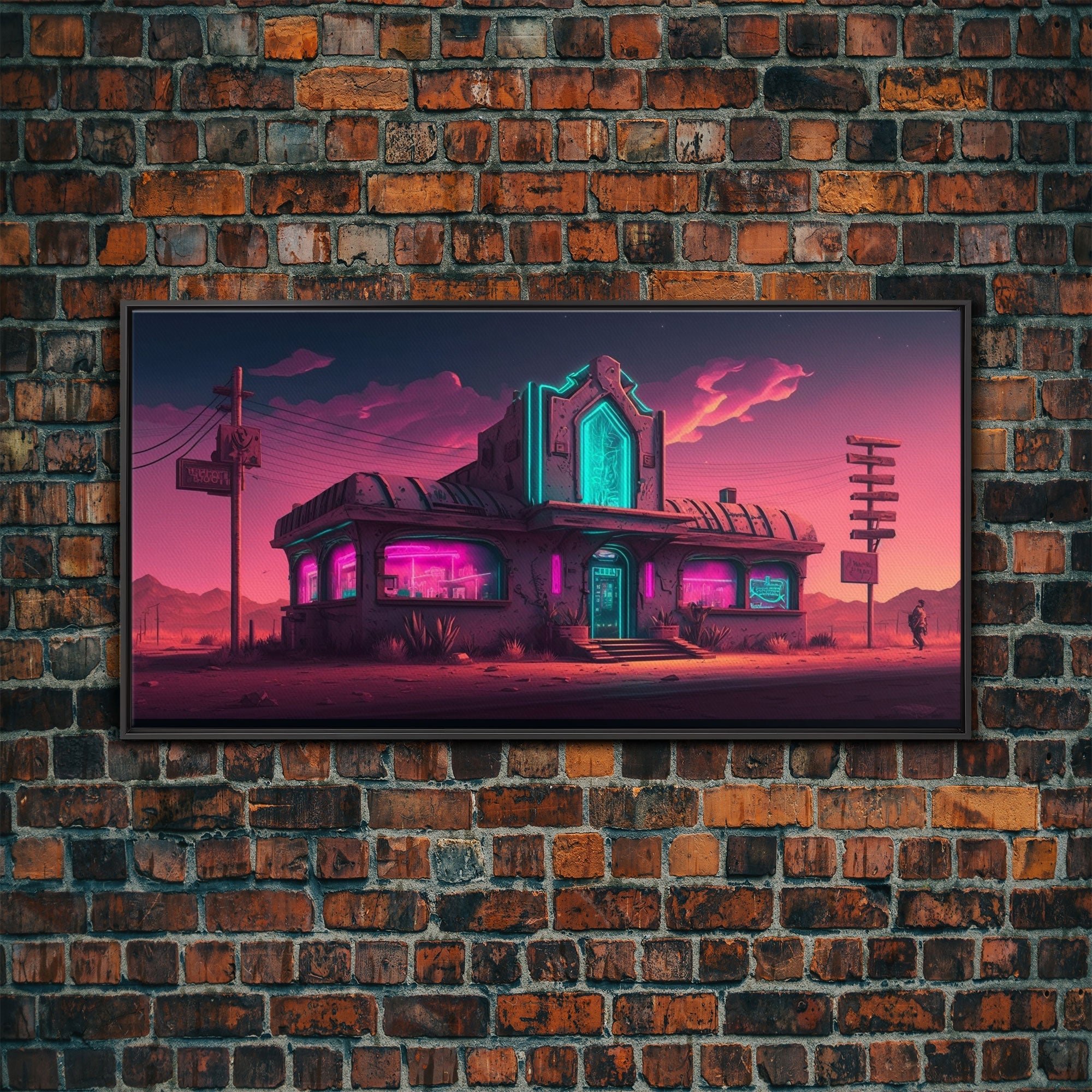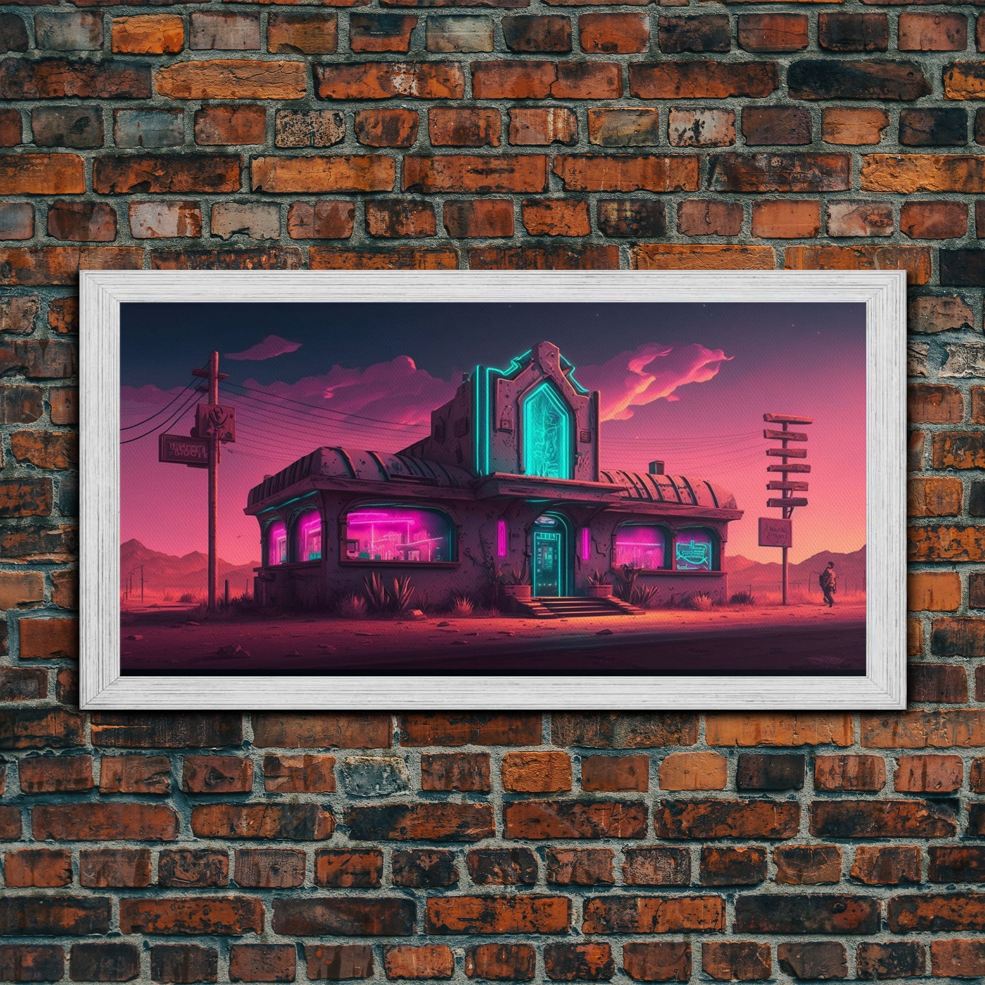 Art Deco Cyberpunk Diner, Wild West Mashup Art, Framed Canvas Print, Neon Art, Wild West Concept Art