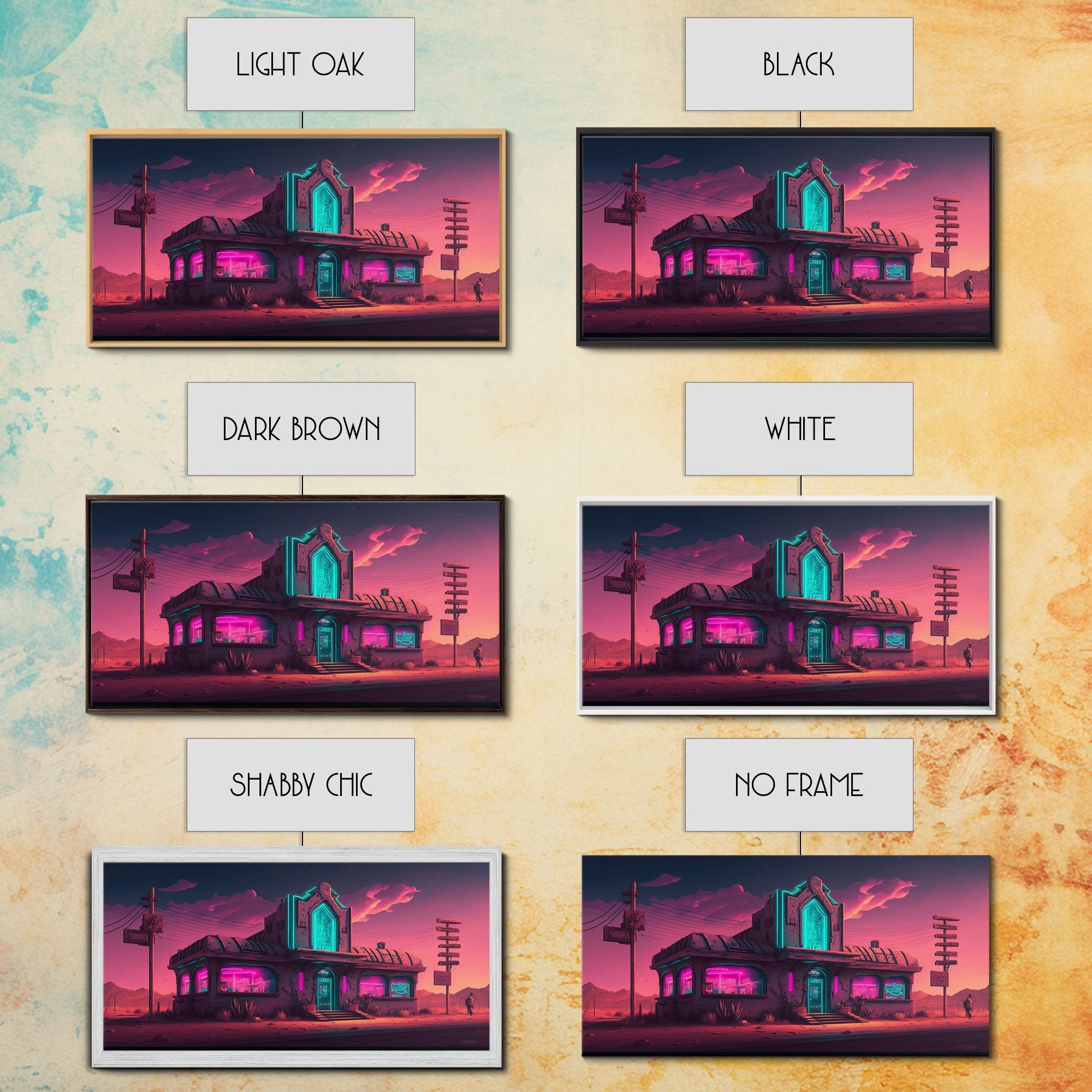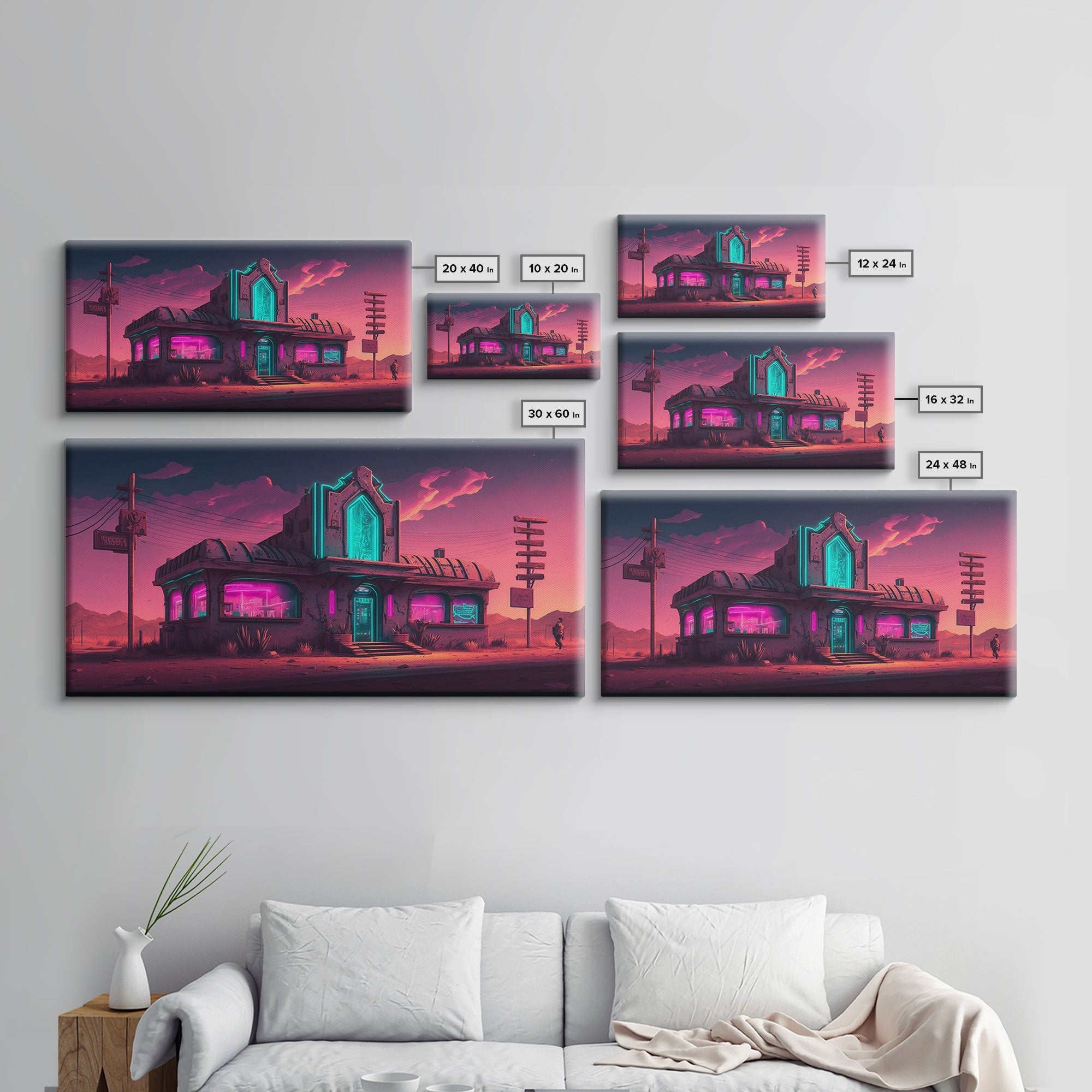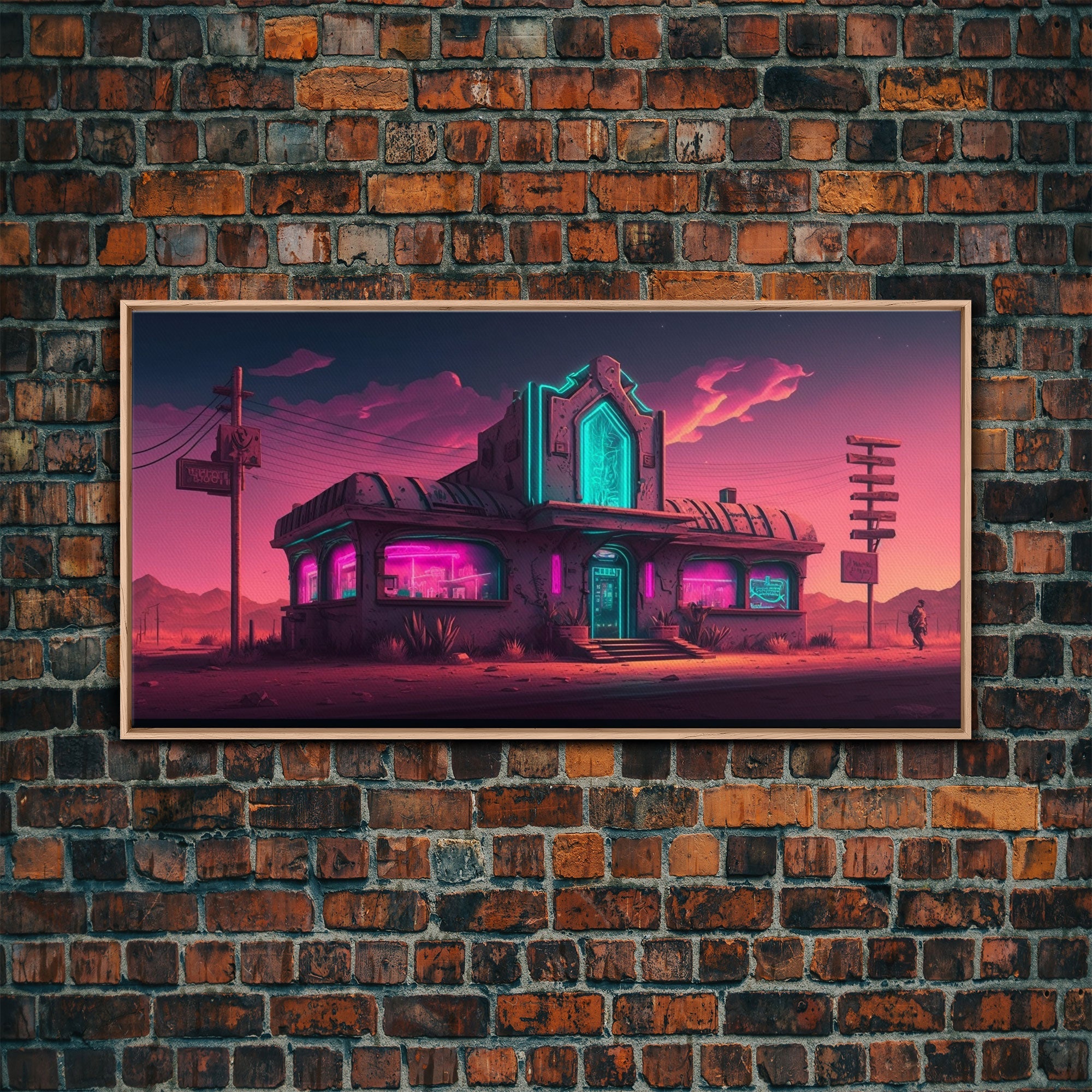 Art Deco Cyberpunk Diner, Wild West Mashup Art, Framed Canvas Print, Neon Art, Wild West Concept Art