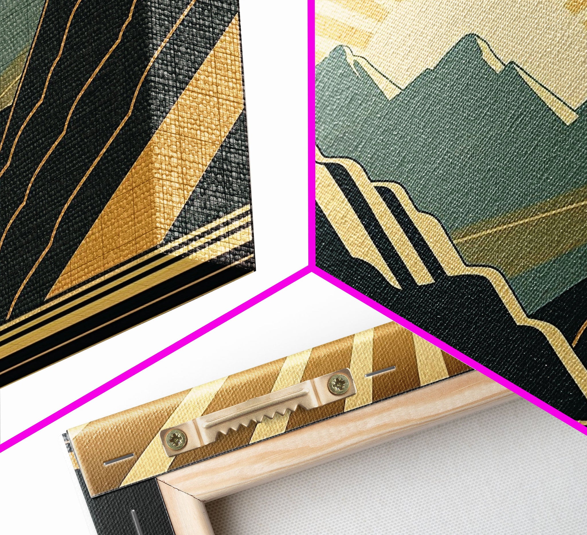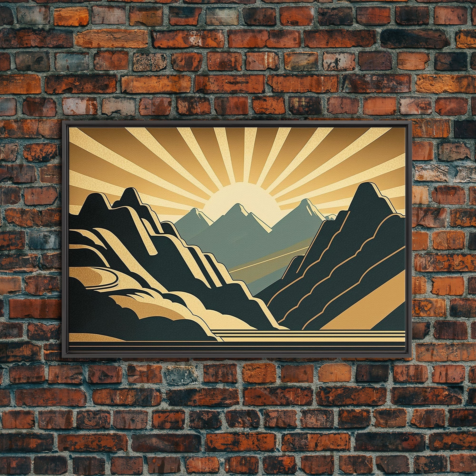 Art Deco Style Mountain landscape at Sunset, Framed Canvas Print, Large Format Wall Art, Huge Wall Decor