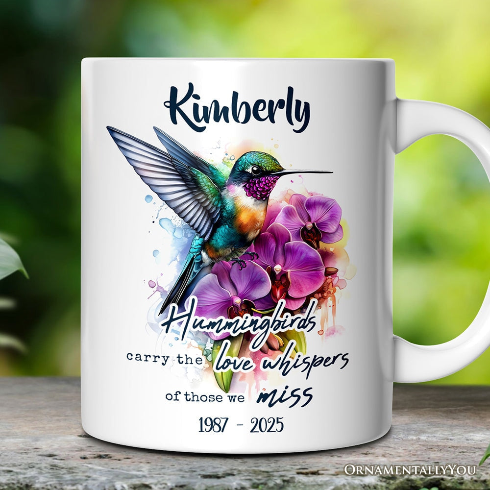 Celebrate the beauty of remembrance with this artistic hummingbird personalized mug, featuring delicate watercolor-style birds and the heartfelt quote, "Carry the Love Whispers." A touching memorial gift, this custom name mug honors cherished memories while offering comfort with every sip. Perfect for those who find solace in nature, this hummingbird coffee cup makes a thoughtful sympathy gift, bereavement keepsake, or tribute to a lost loved one. Crafted with vibrant, high-quality printing, this custom memorial mug is ideal for daily use, reminding you of the love that never fades.