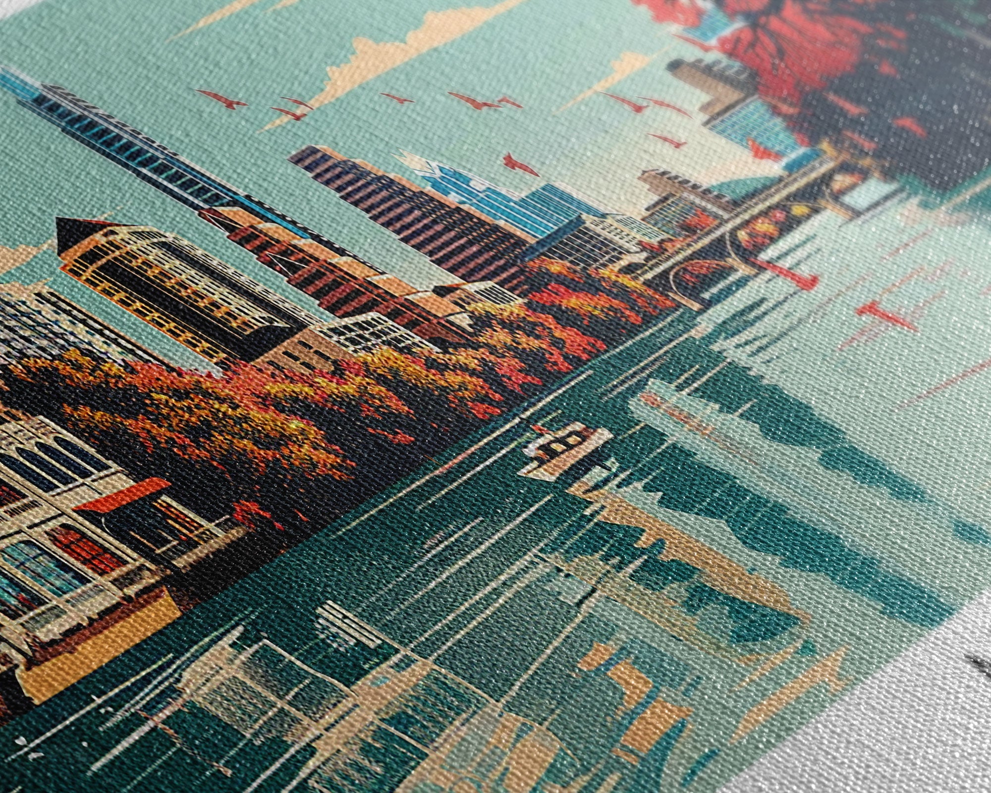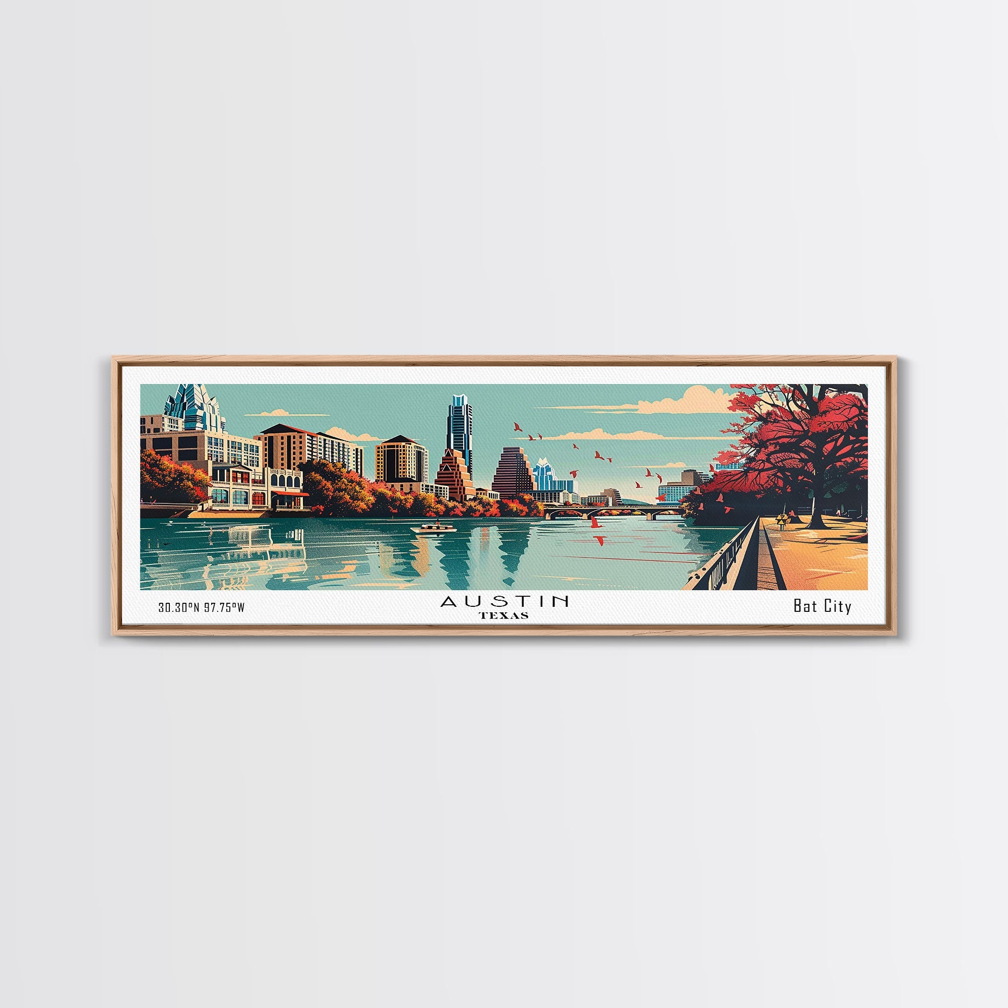 Austin Texas Panoramic Painting, Framed Canvas Print, Mid Century Modern Wall Art, Retro Pop Art Travel Poster, Home Decor, City Art