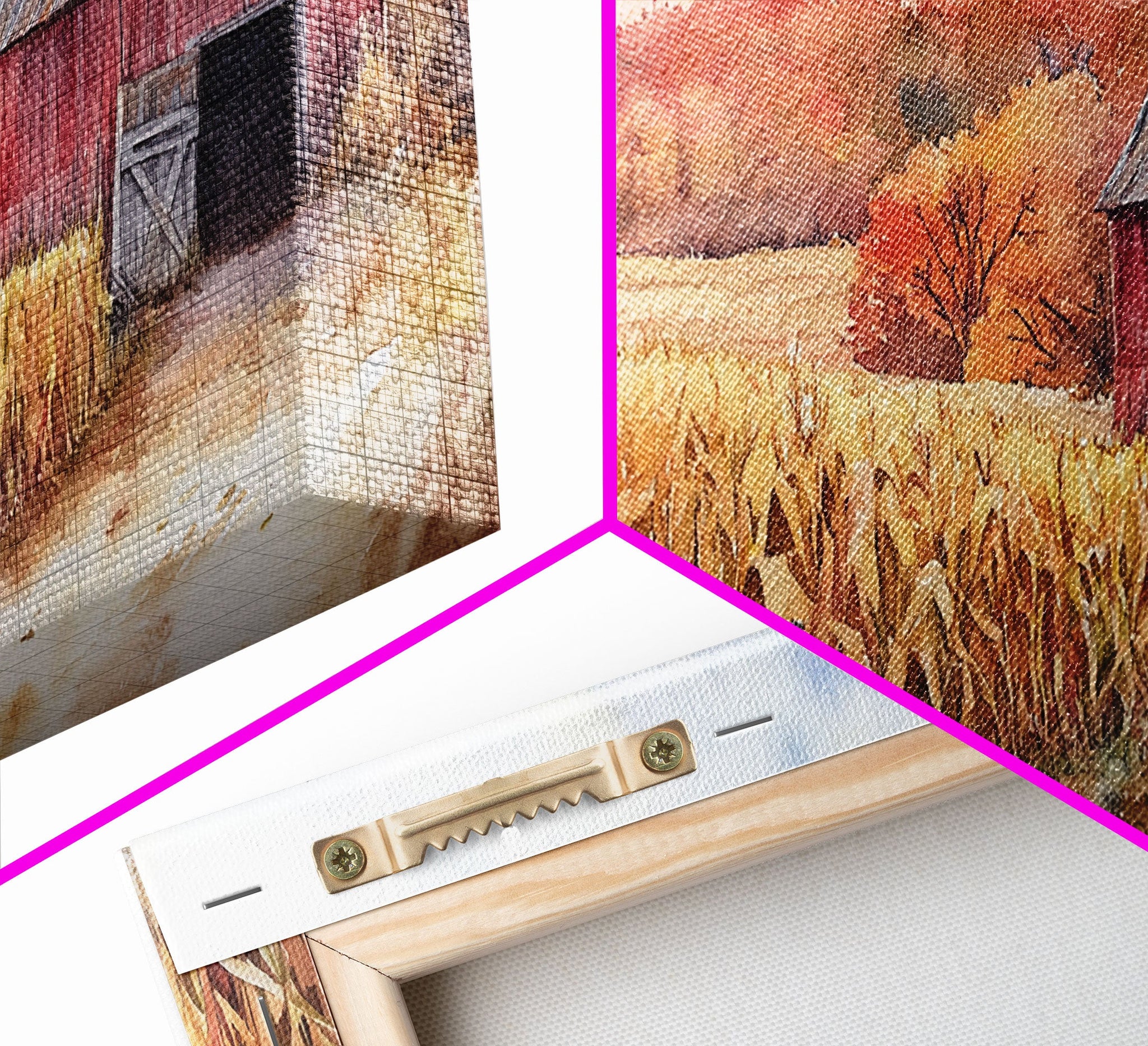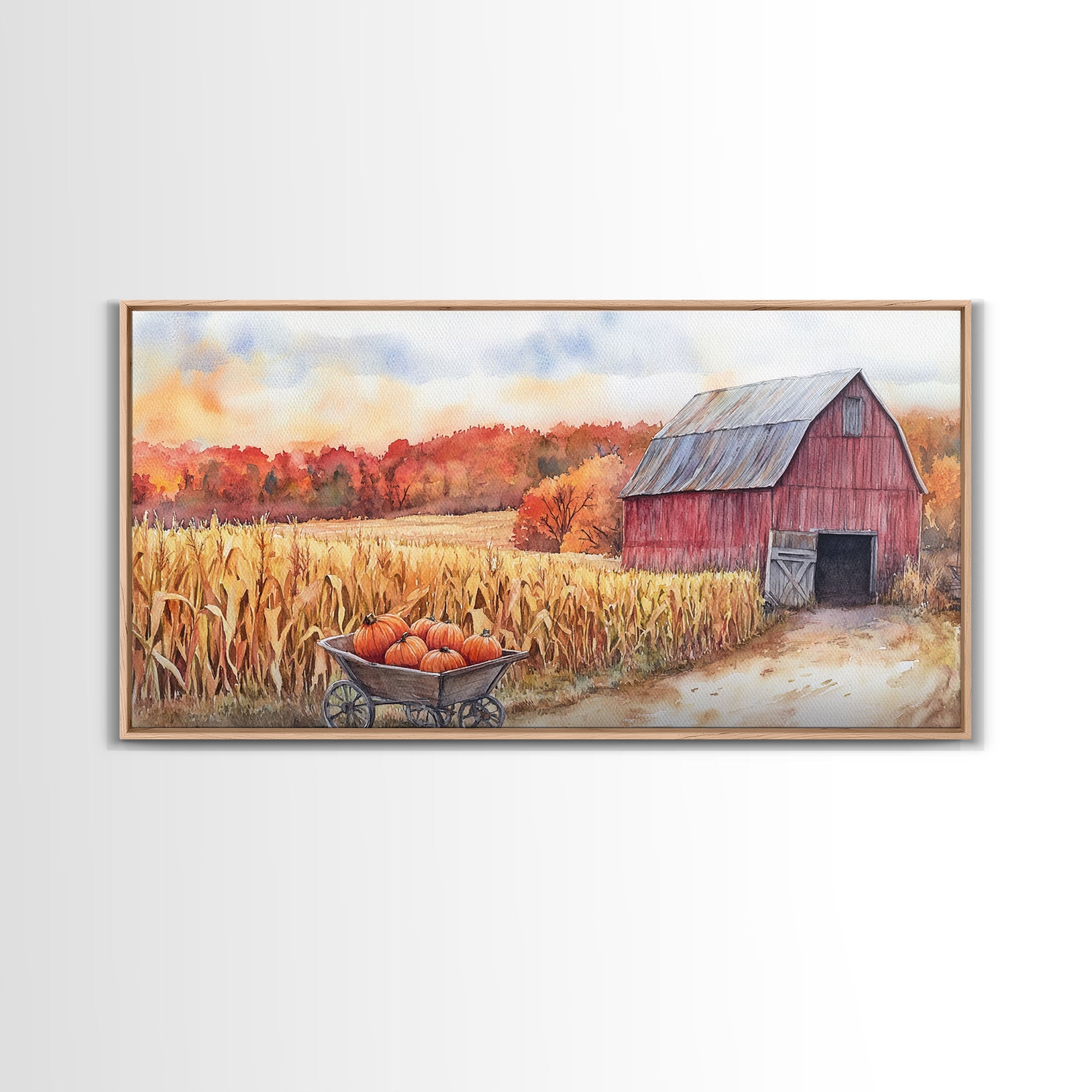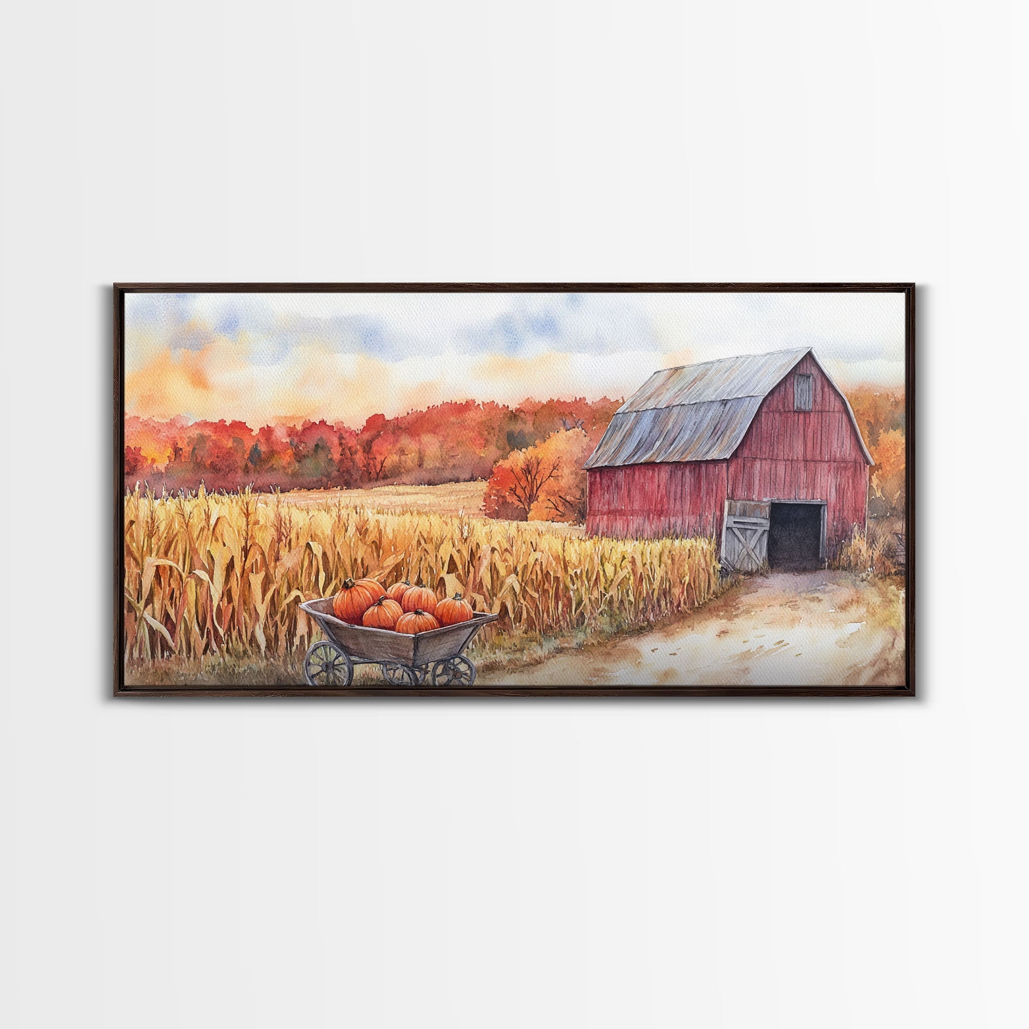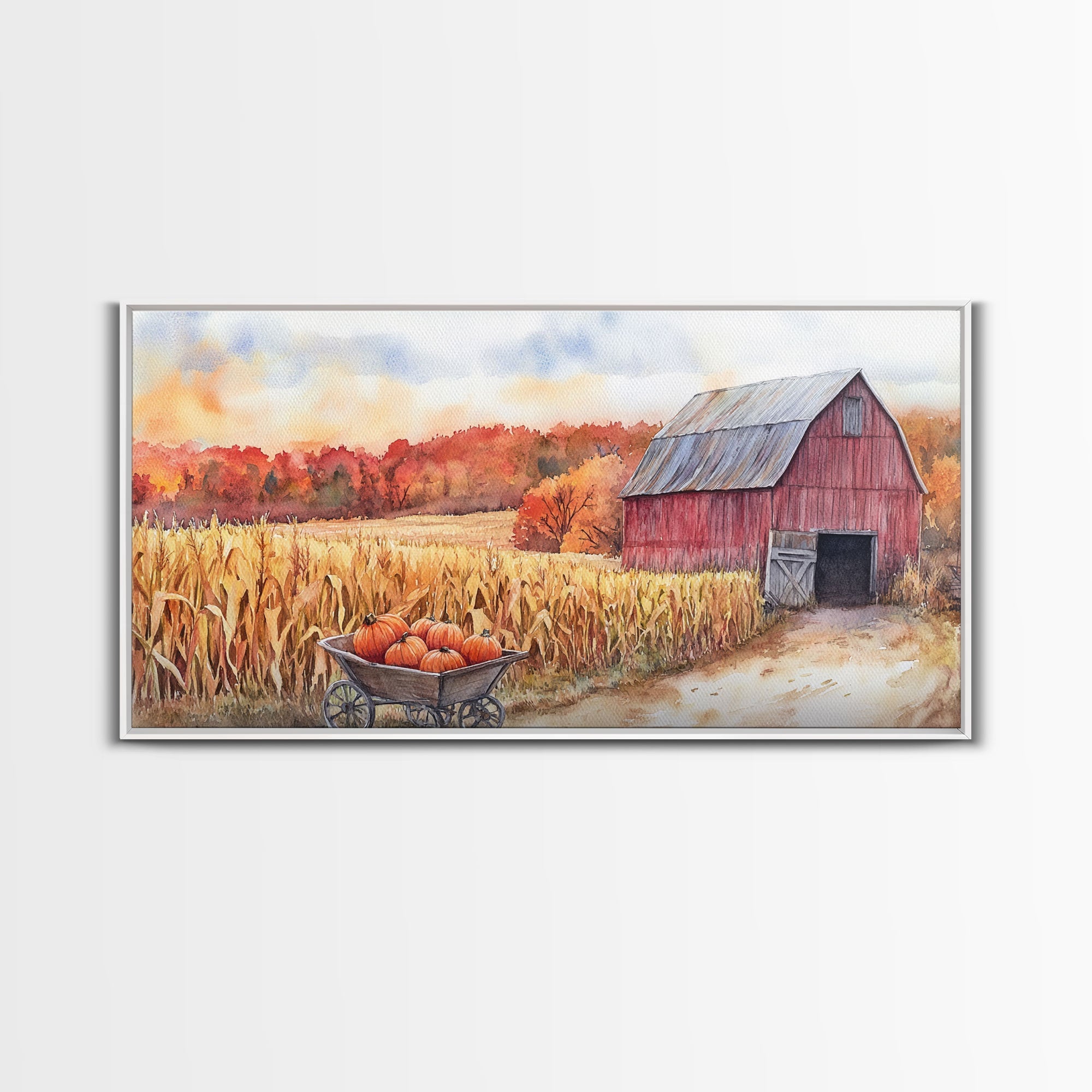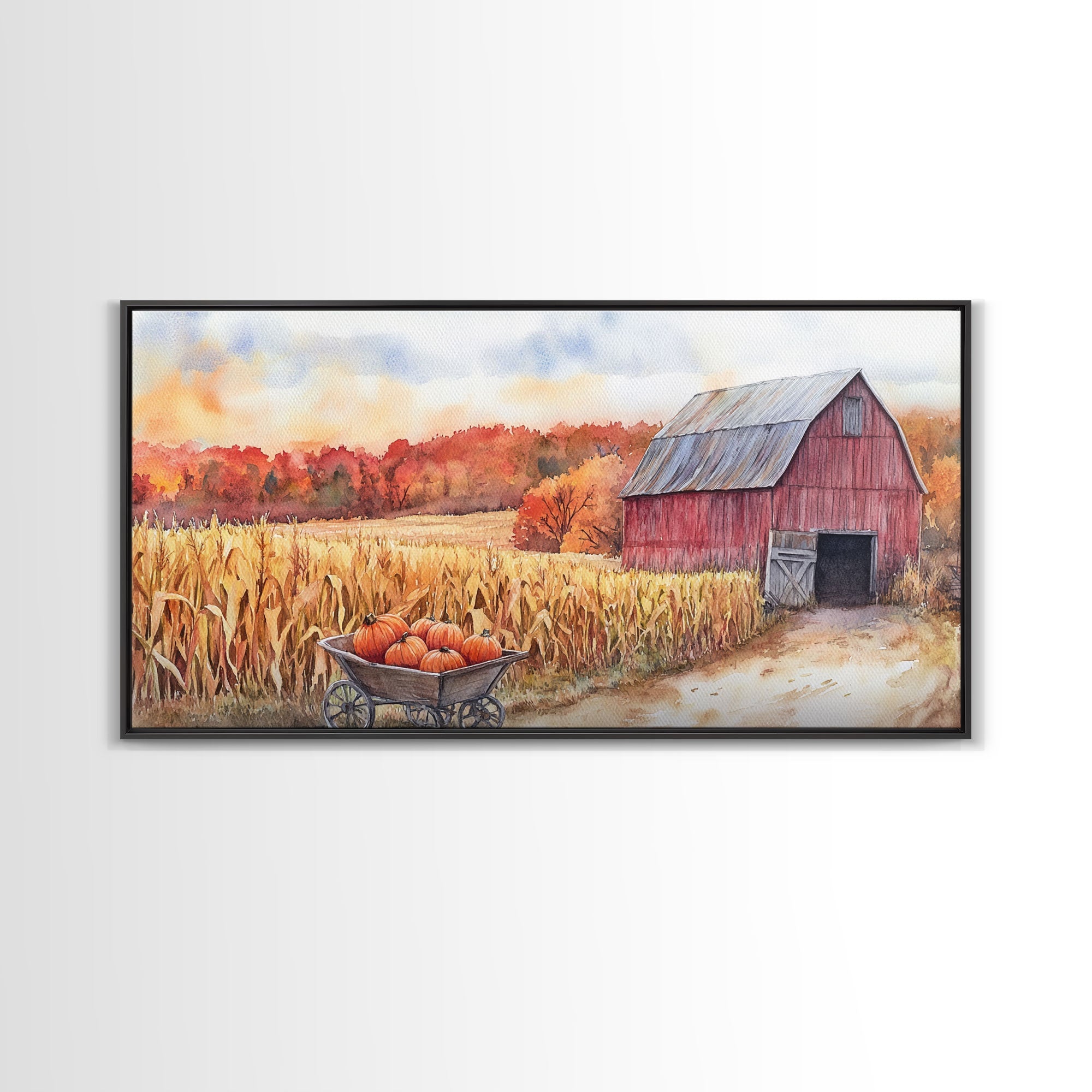 Autumn Barn with Pumpkins in Wheelbarrow, Farmhouse Fall Decor, Framed Canvas Print, Seasonal Wall Art, Country Home Decor, Gift Idea