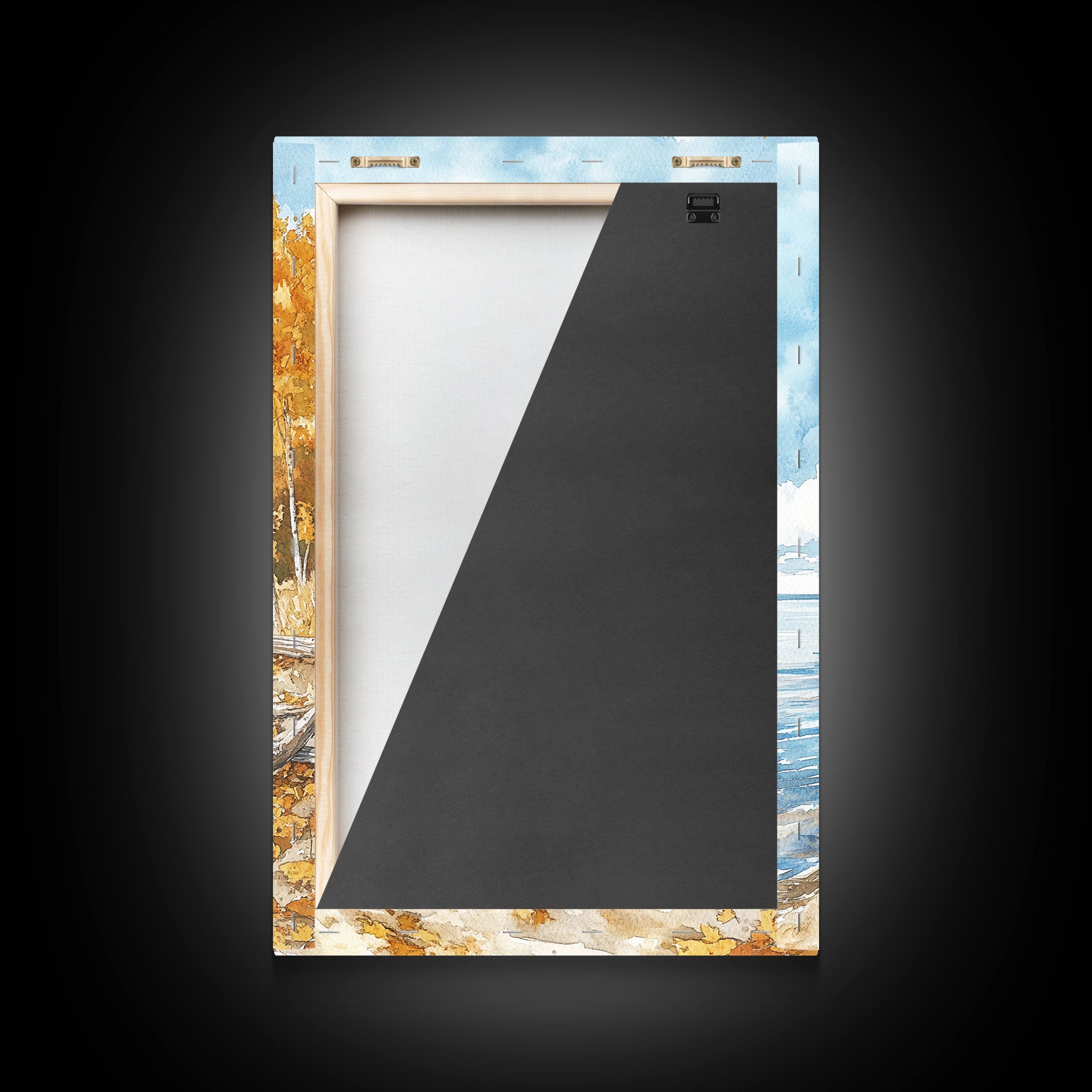 Autumn beach scene with golden trees and calm shoreline Framed Canvas Print, fall landscape art perfect autumn wall decor for rustic homes