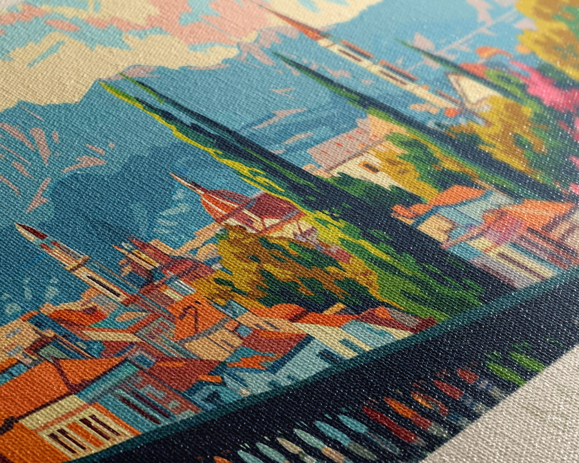 Most of our canvases are made in the USA, with the exception of canvases ordered with the light oak unstained frames, and any large canvases (24x48, 30x60, 16x48 and 20x60) ordered WITH a frame. These are temporarily made in and shipped from Europe, while we try to find a more consistent supplier in the USA.
