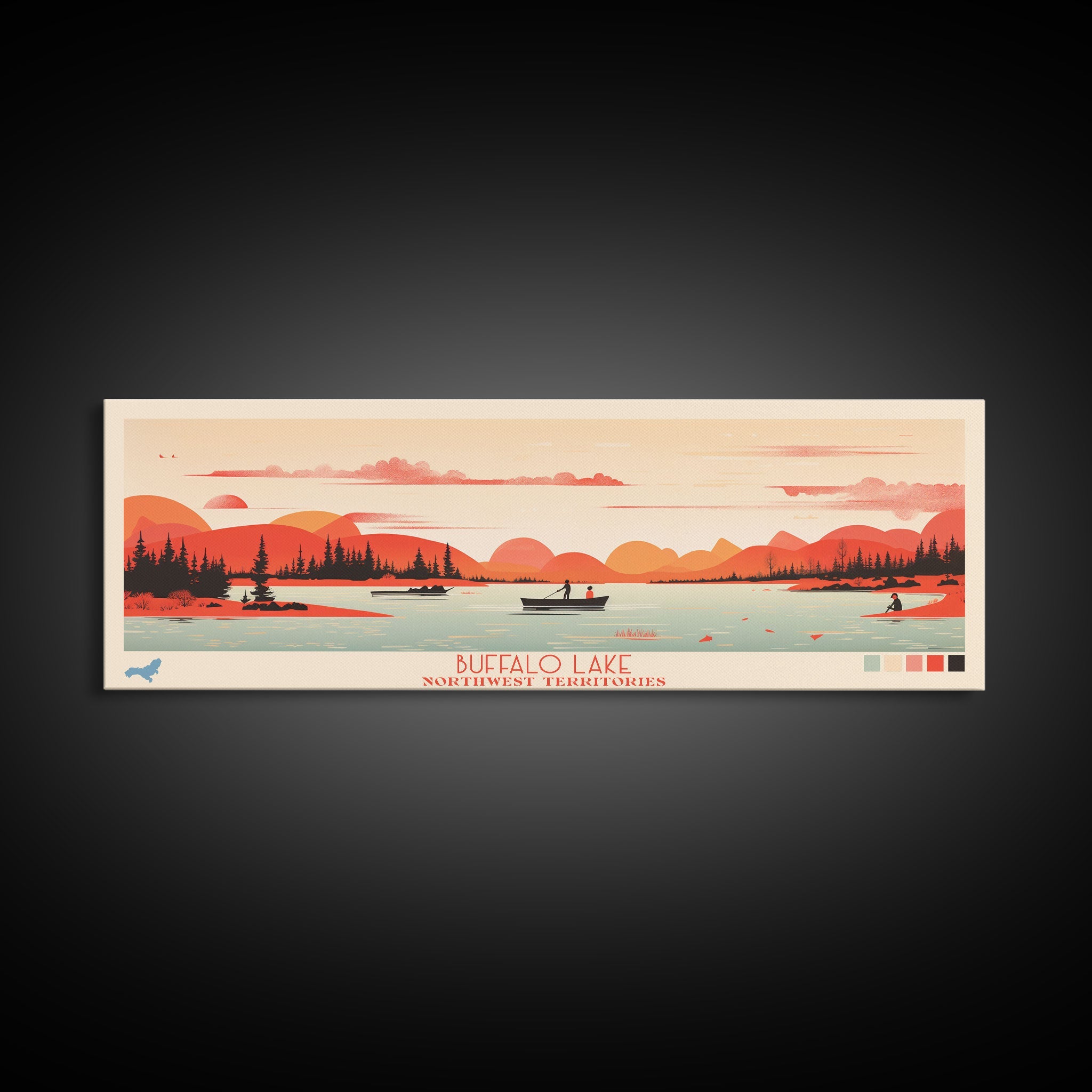 Buffalo Lake Northwest Territories Framed Canvas Print, Pop Art Panoramic Travel Poster, Midcentury Modern, Wall Art, Scenic Nature Painting, Bedroom Decor