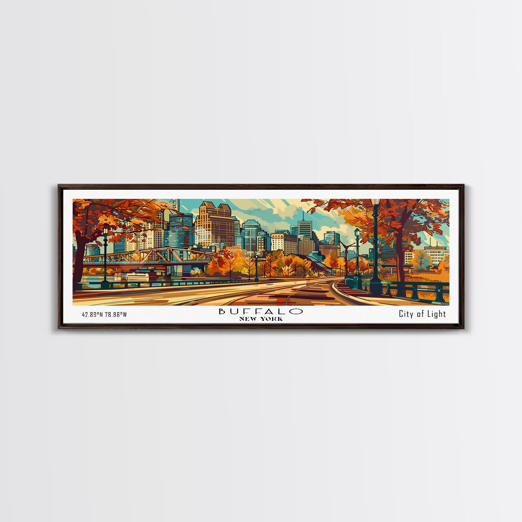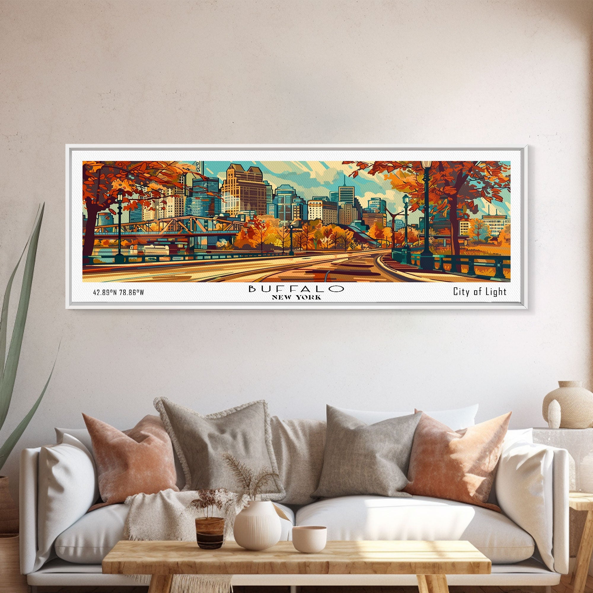 Buffalo New York Panoramic Painting Framed Canvas Print, Mid Century Modern Art, Pop Art Style, Travel Poster, Living Room Decor