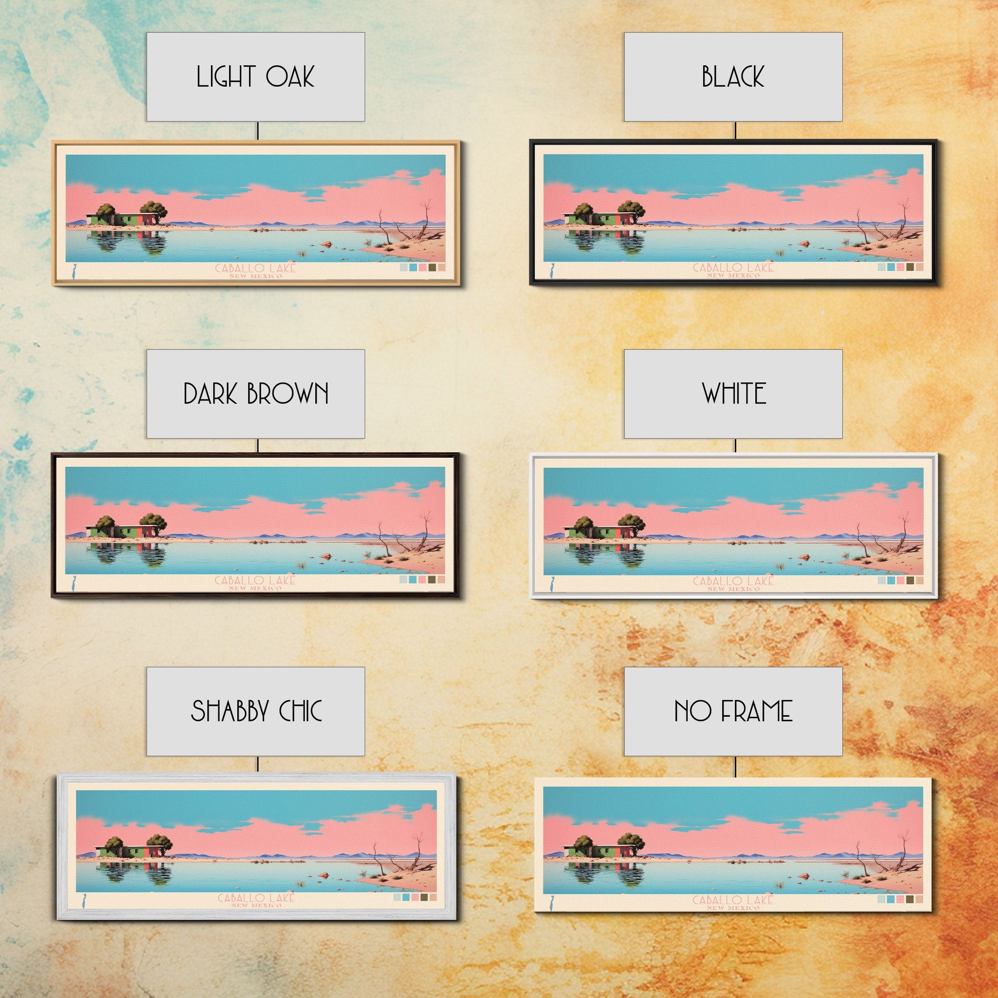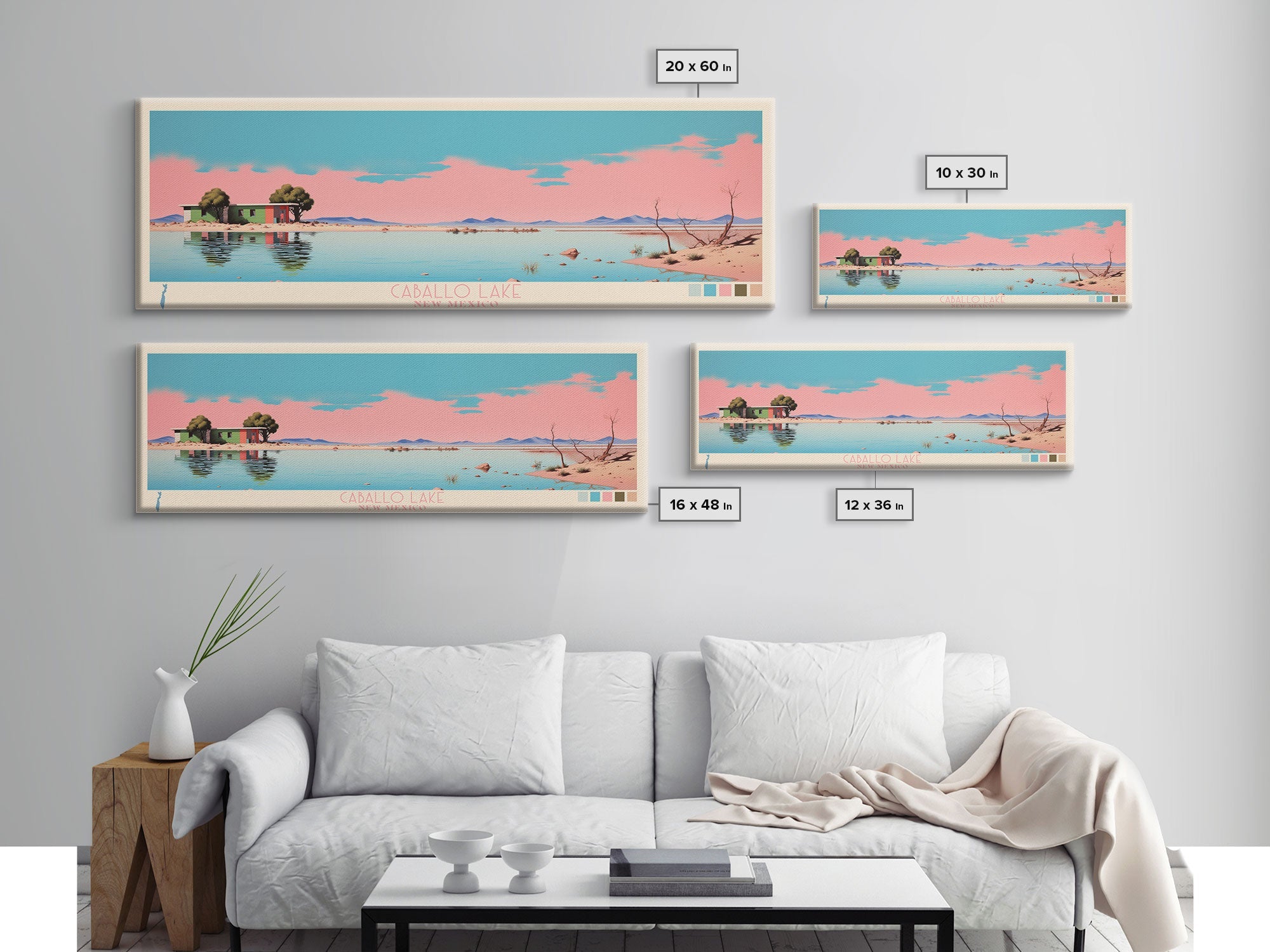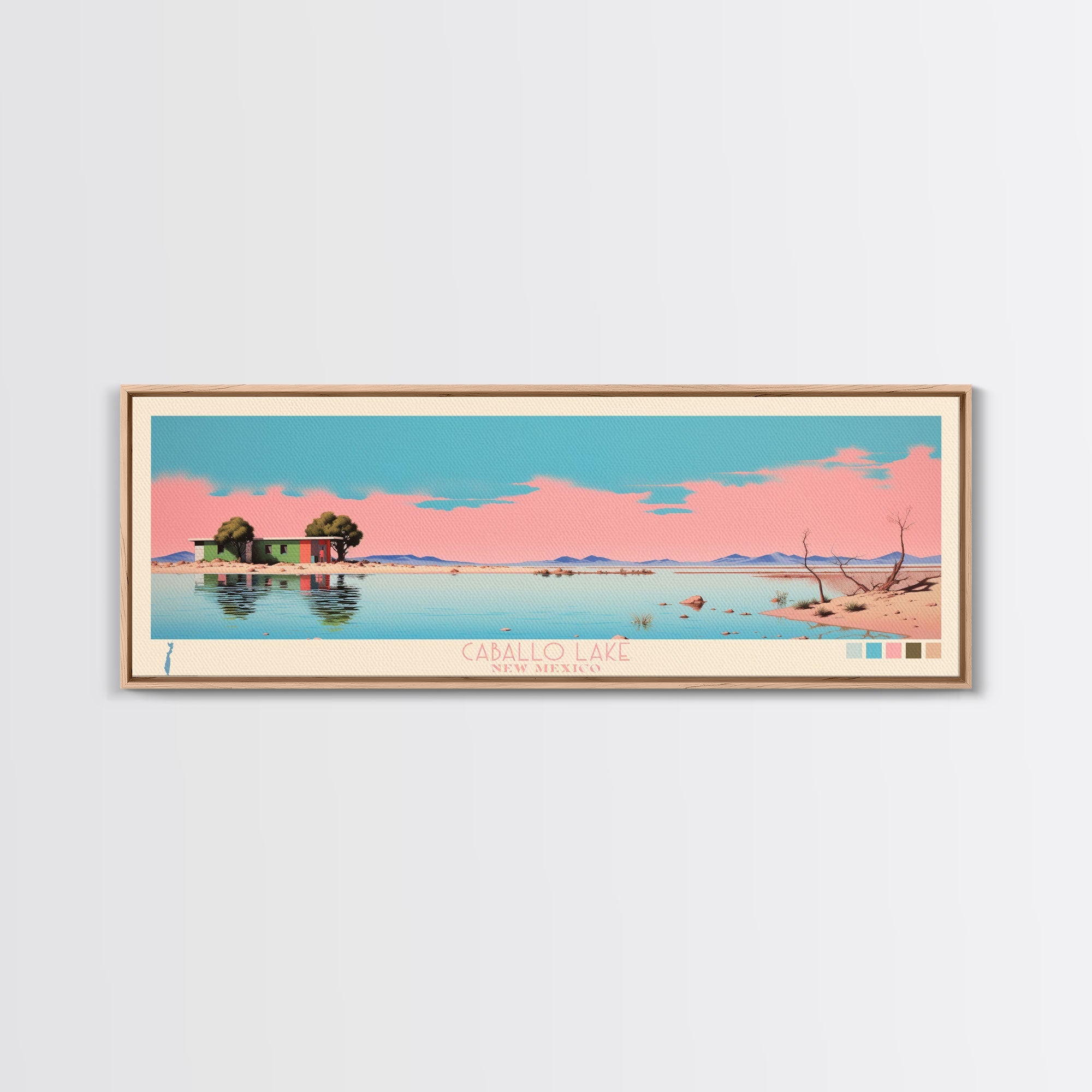 Caballo Lake New Mexico Framed Canvas Print, Midcentury Modern Panoramic Wall Art, Living Room Decor, Pop Art, Travel Poster Art, Scenic Nature Painting