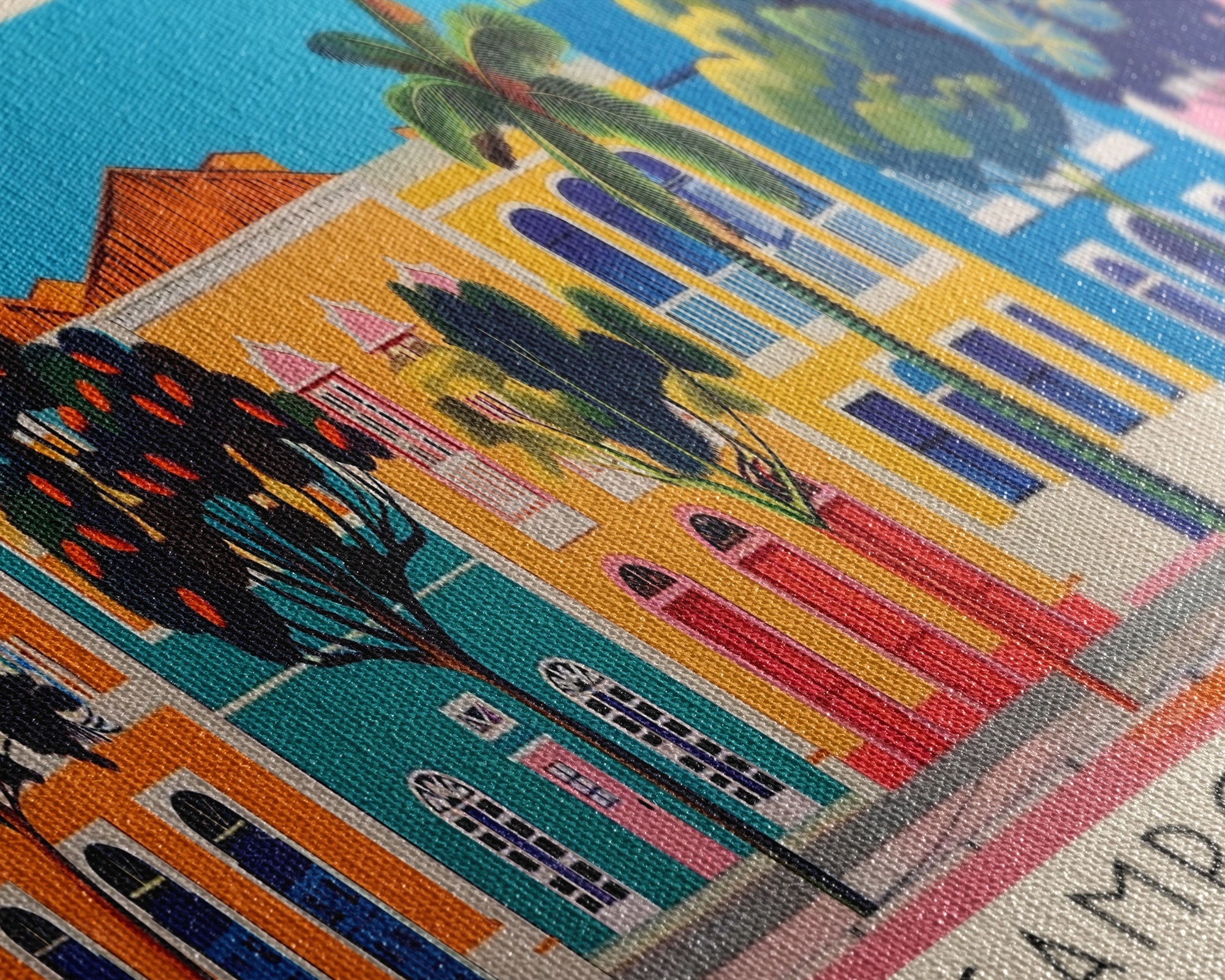 Most of our canvases are made in the USA, with the exception of canvases ordered with the light oak unstained frames, and any large canvases (24x48, 30x60, 16x48 and 20x60) ordered WITH a frame. These are temporarily made in and shipped from Europe, while we try to find a more consistent supplier in the USA.