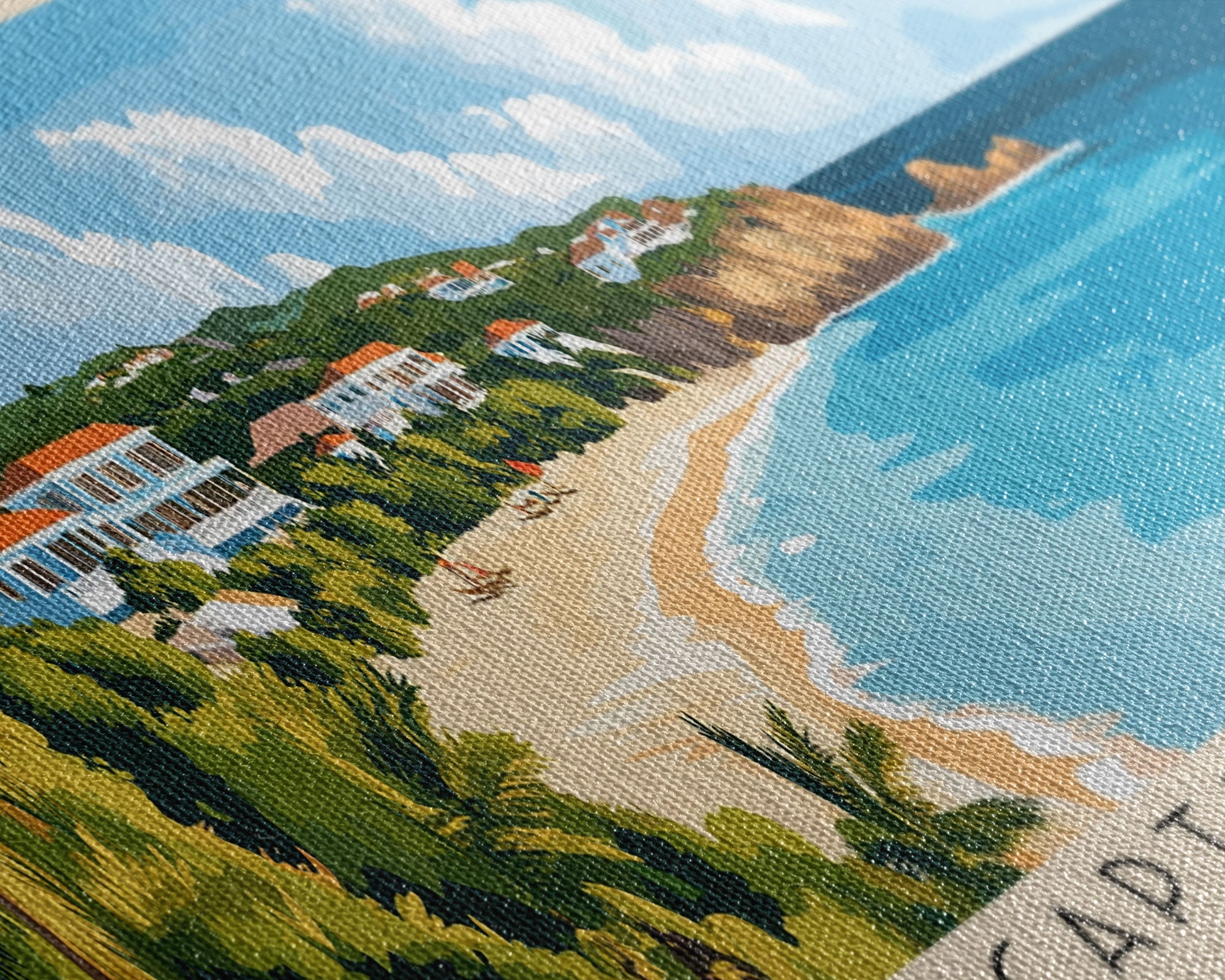 Most of our canvases are made in the USA, with the exception of canvases ordered with the light oak unstained frames, and any large canvases (24x48, 30x60, 16x48 and 20x60) ordered WITH a frame. These are temporarily made in and shipped from Europe, while we try to find a more consistent supplier in the USA.