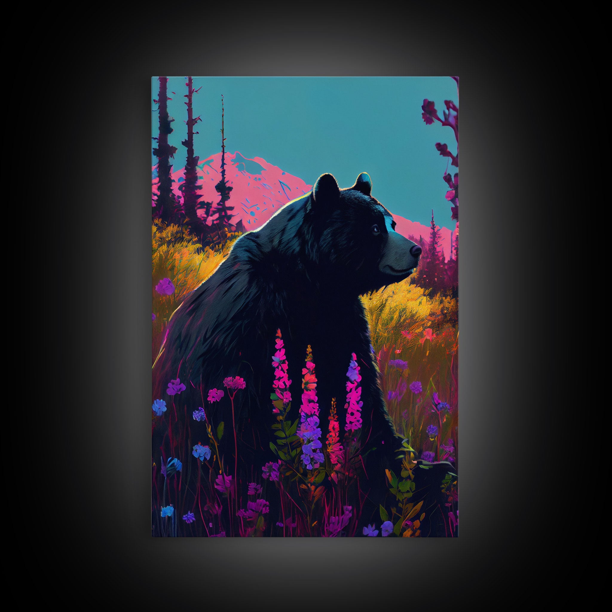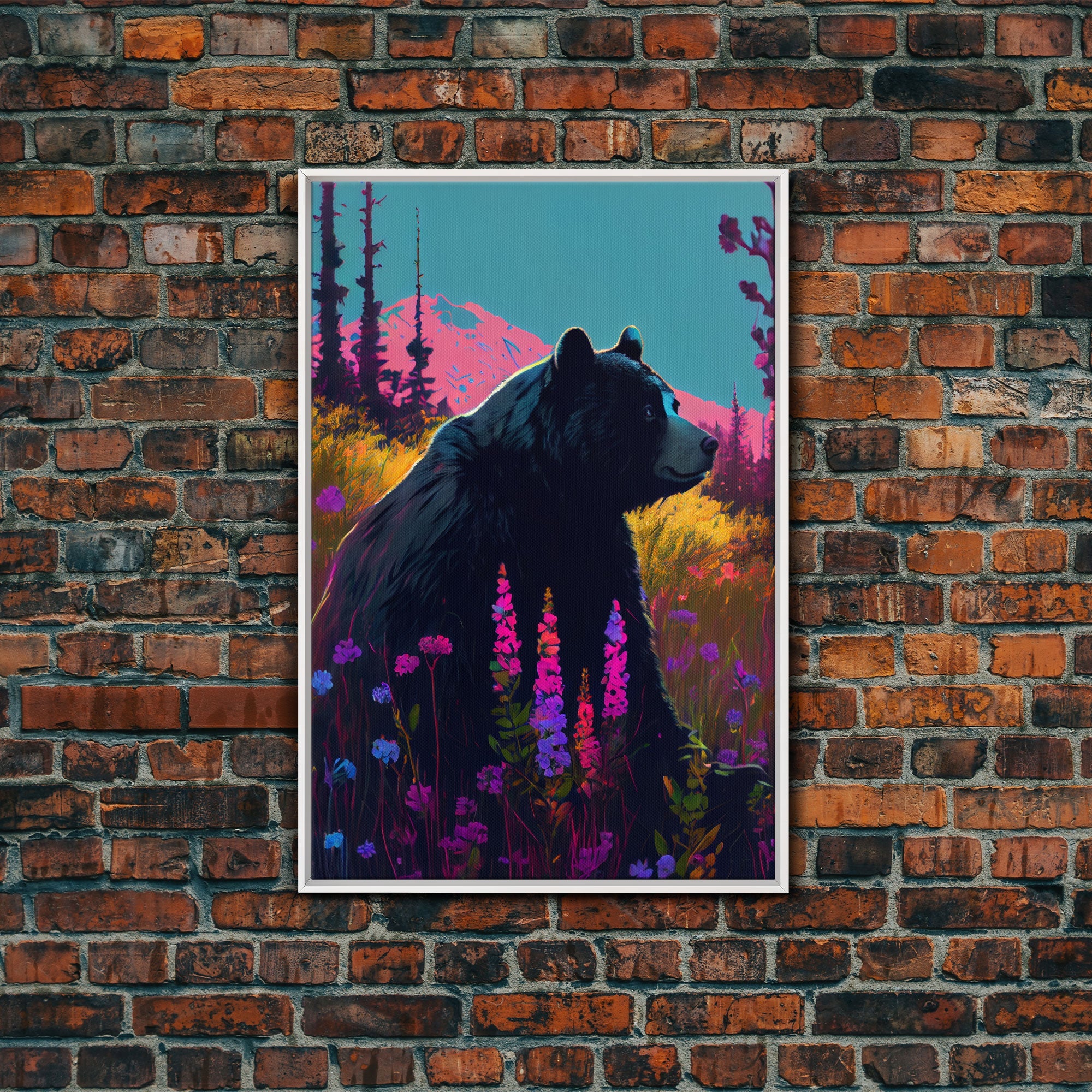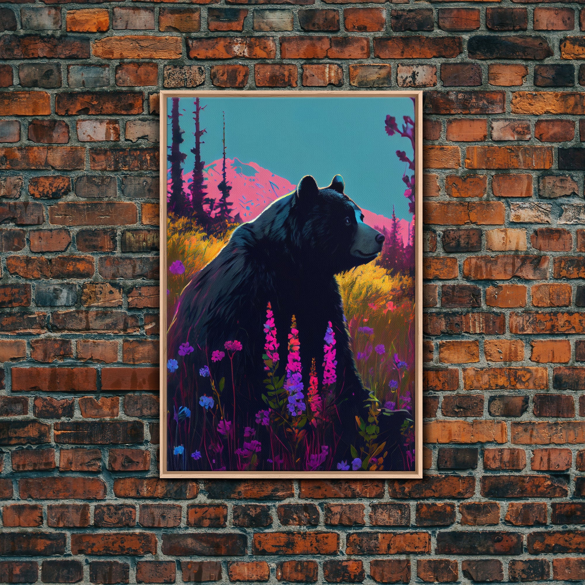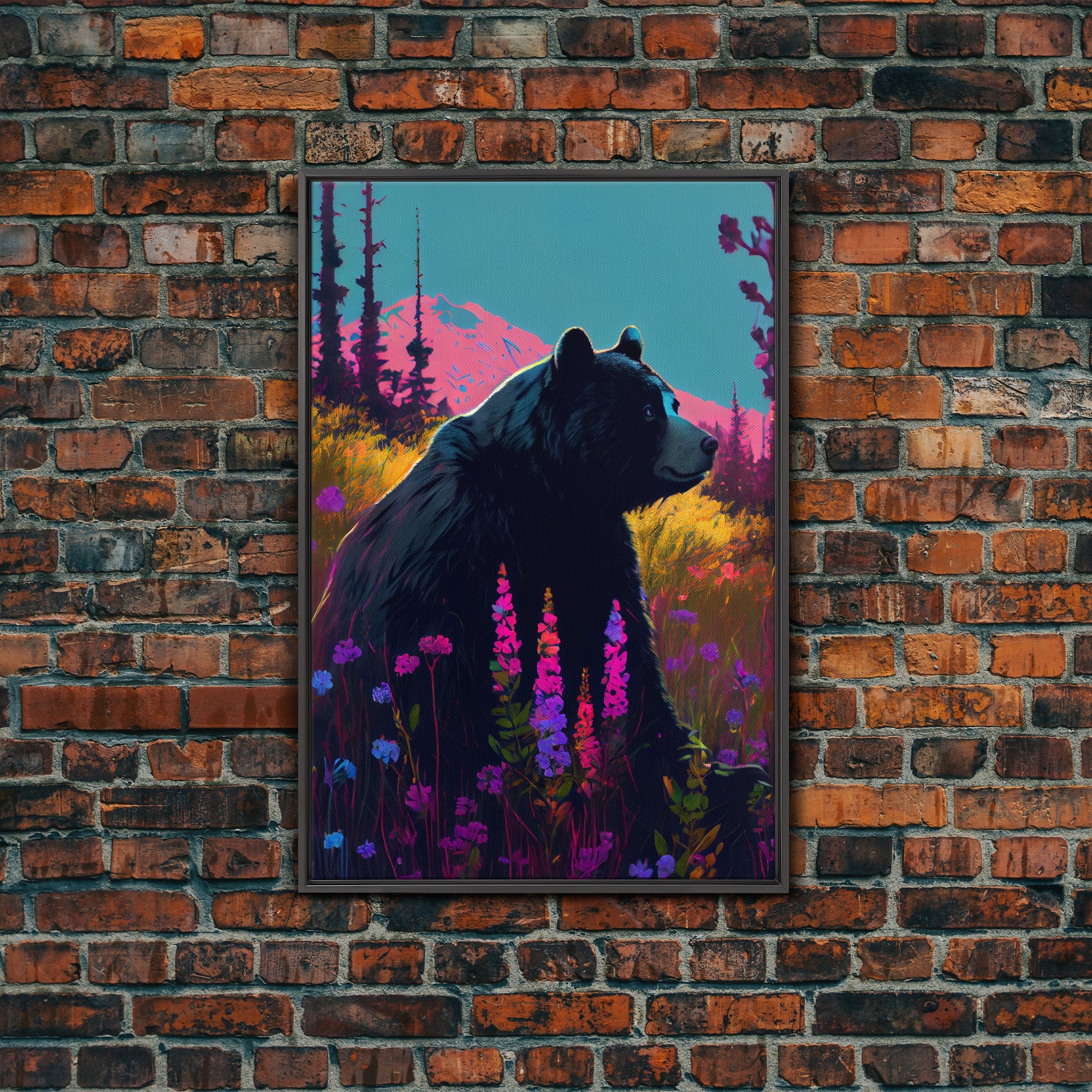 • Carregar imagem no visualizador da galeria, Cute brown bear stopping to smell the flowers, animal prints, framed canvas print, colorful unique wall art