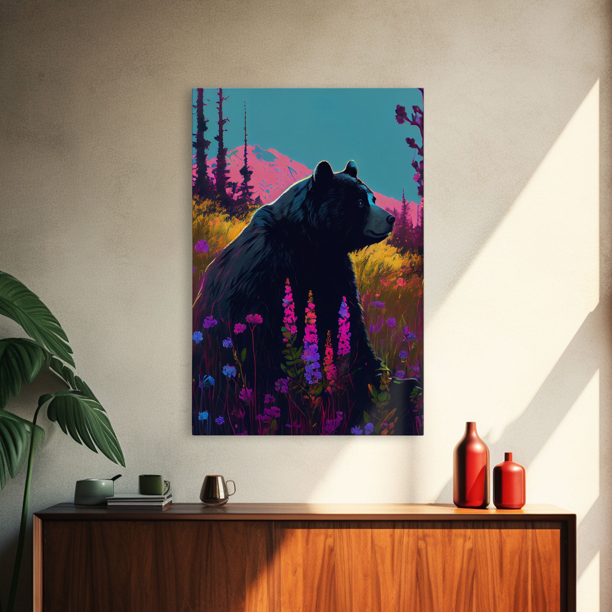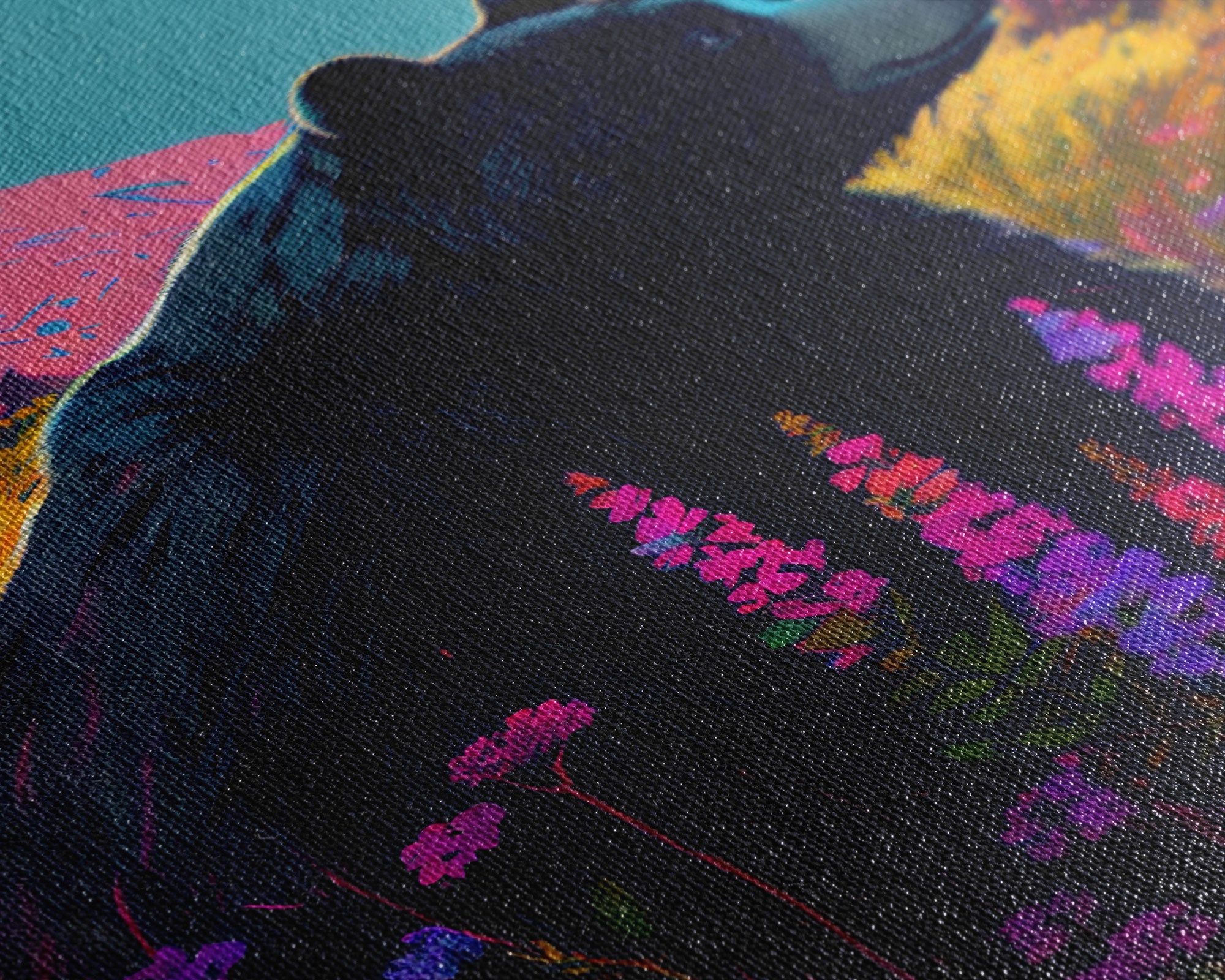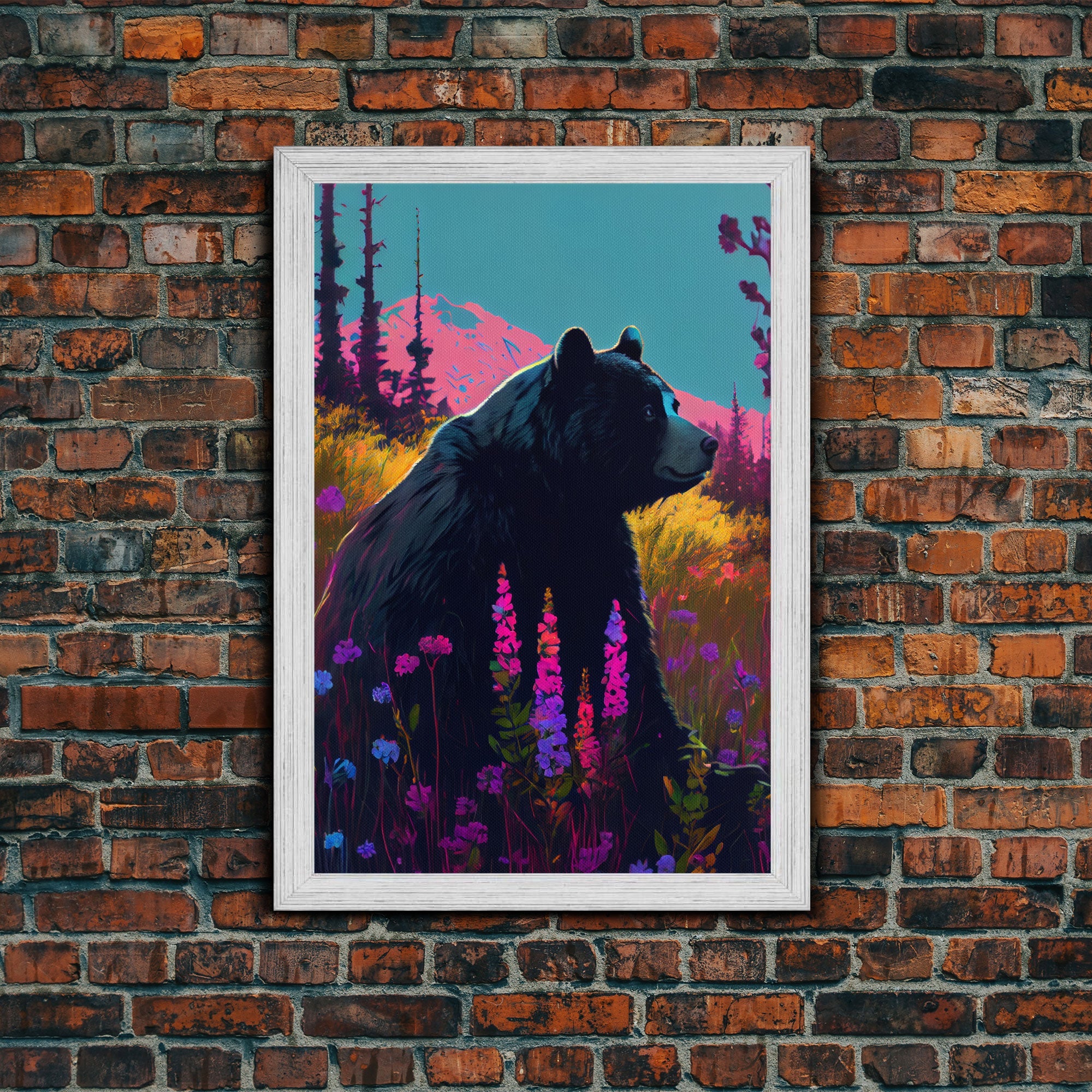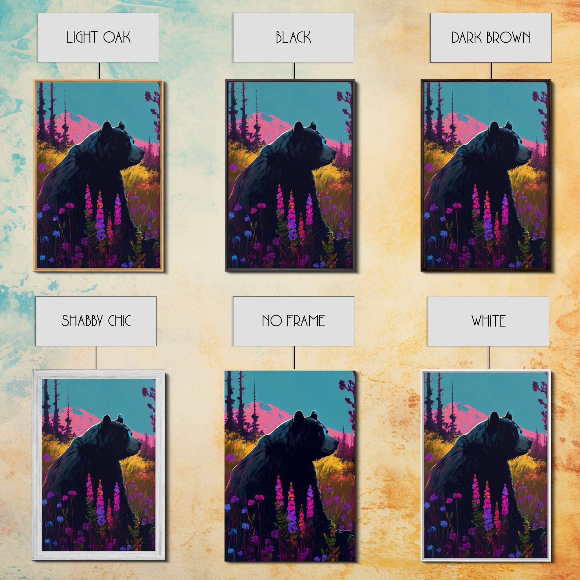 • Carregar imagem no visualizador da galeria, Cute brown bear stopping to smell the flowers, animal prints, framed canvas print, colorful unique wall art