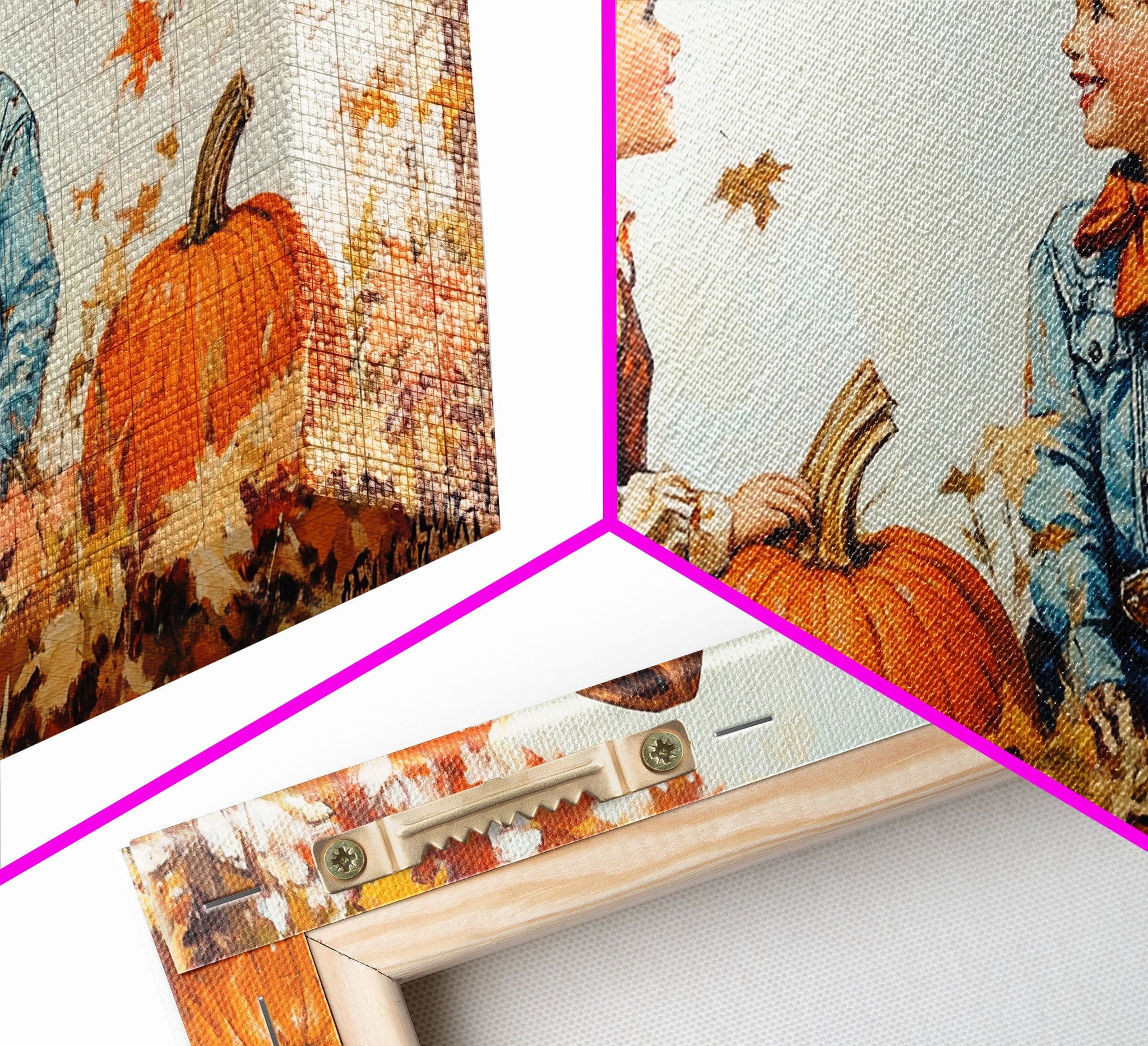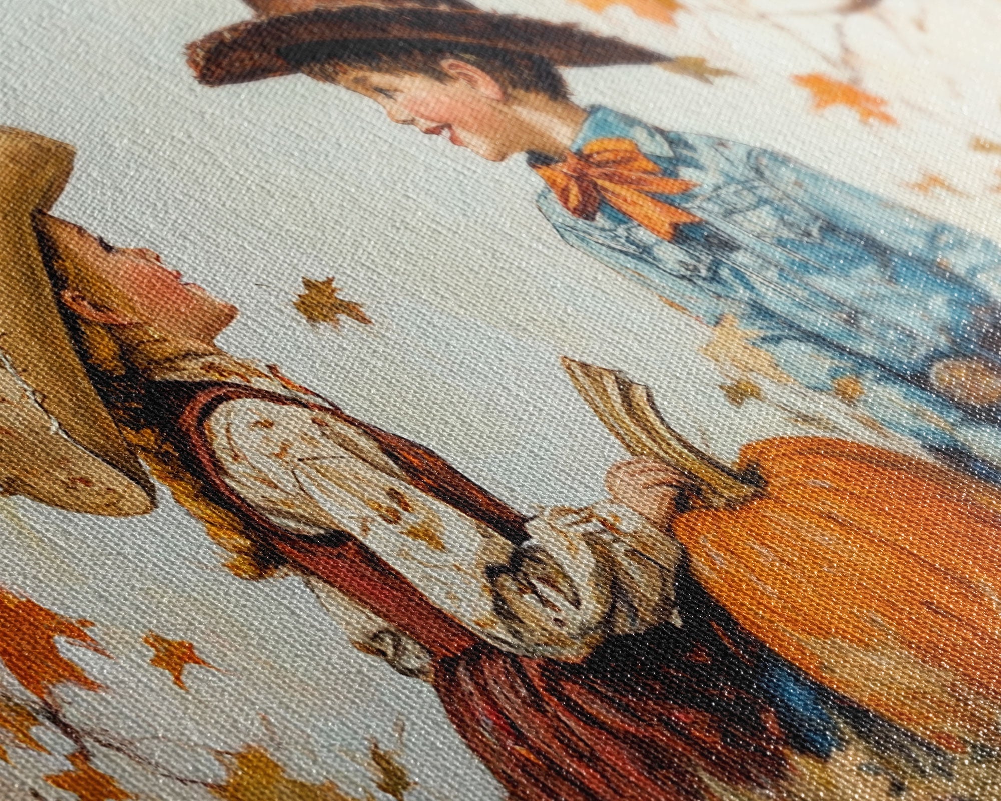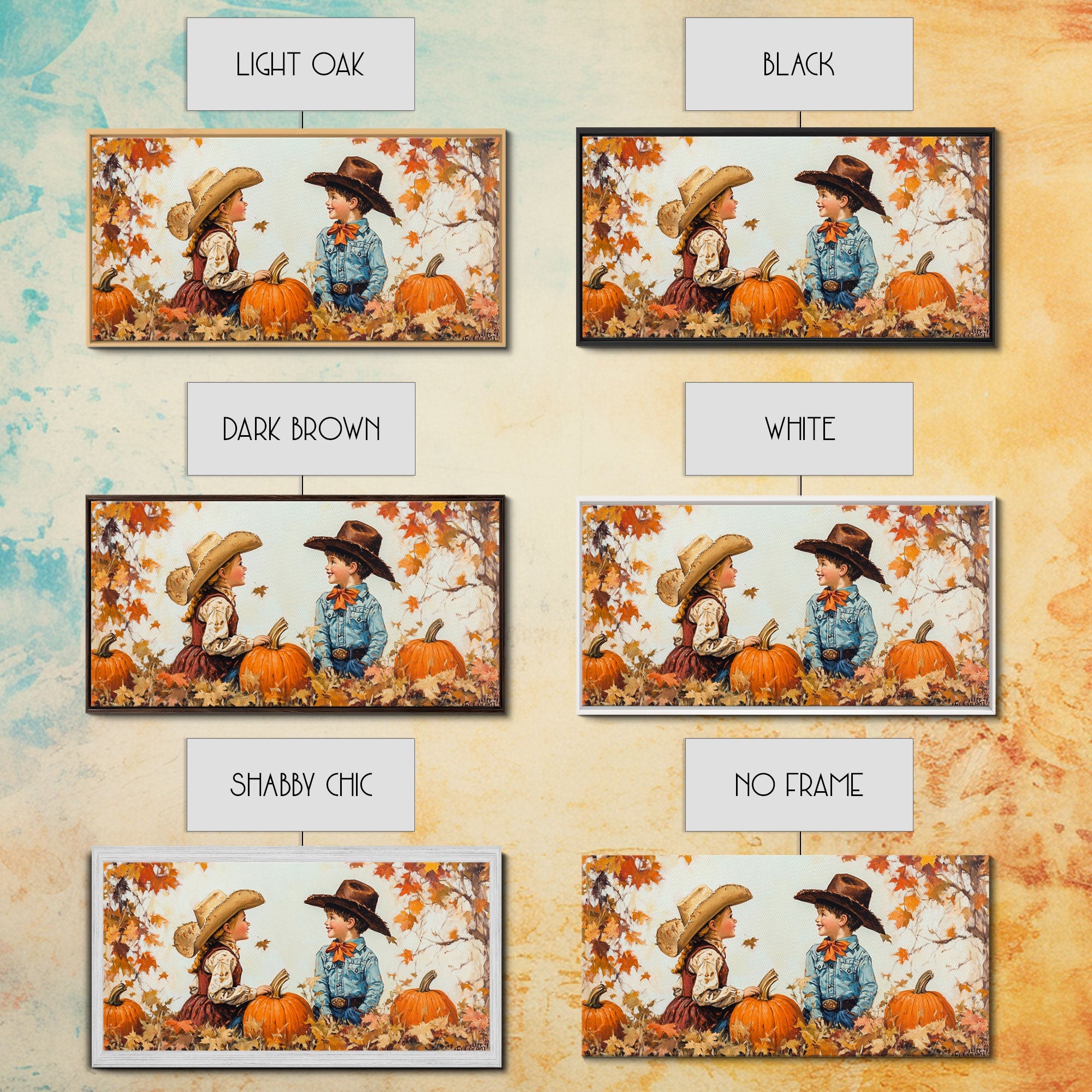 Cute Cowboy and Cowgirl In a Pumpkin Patch, Framed Canvas Print, 1950s Style Wall Art, Nursery Decor