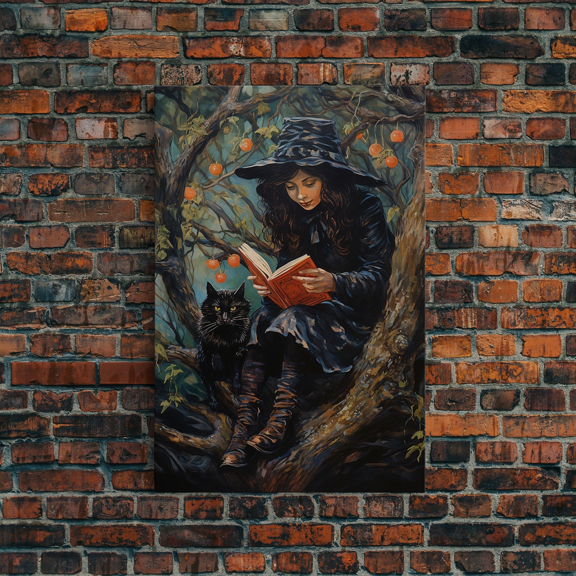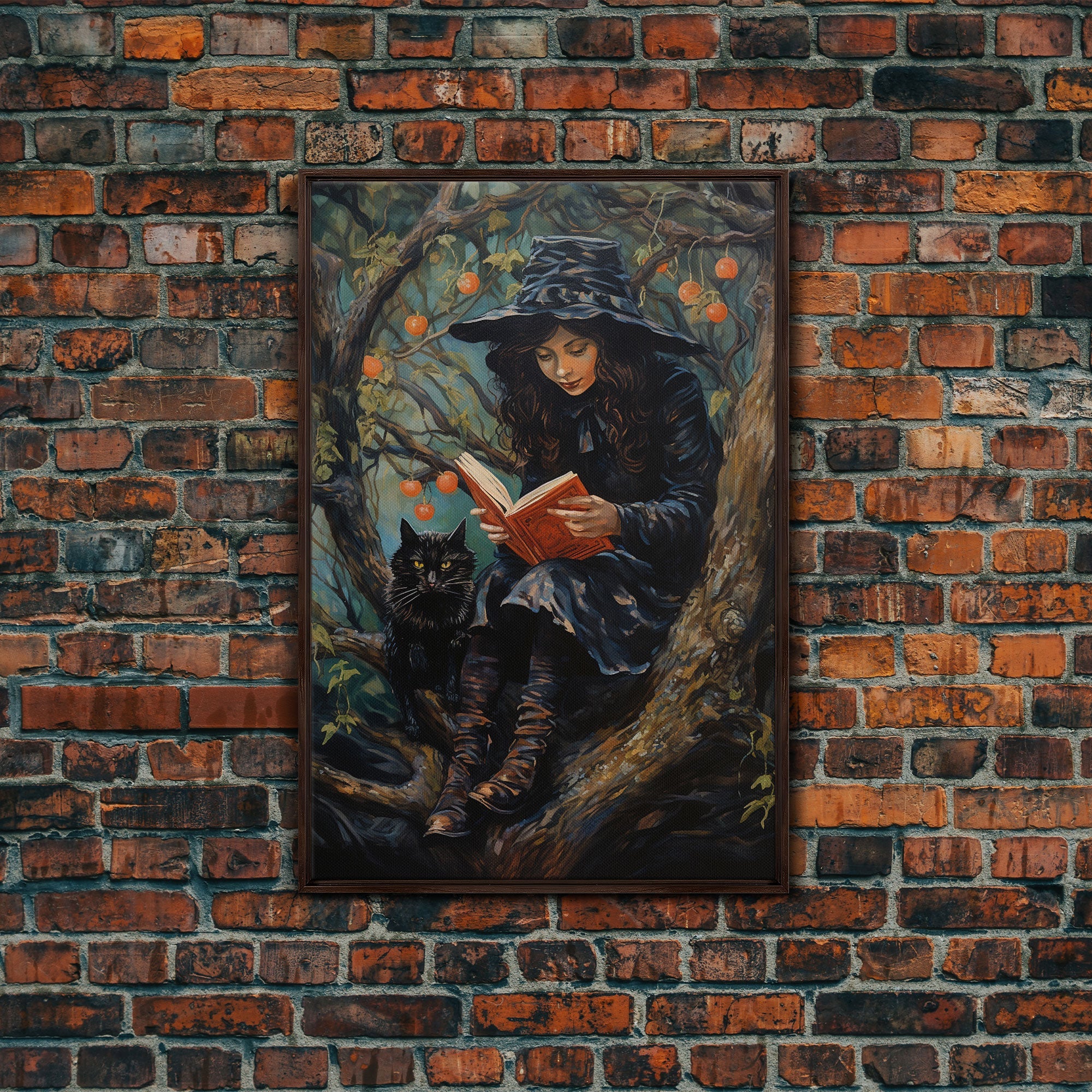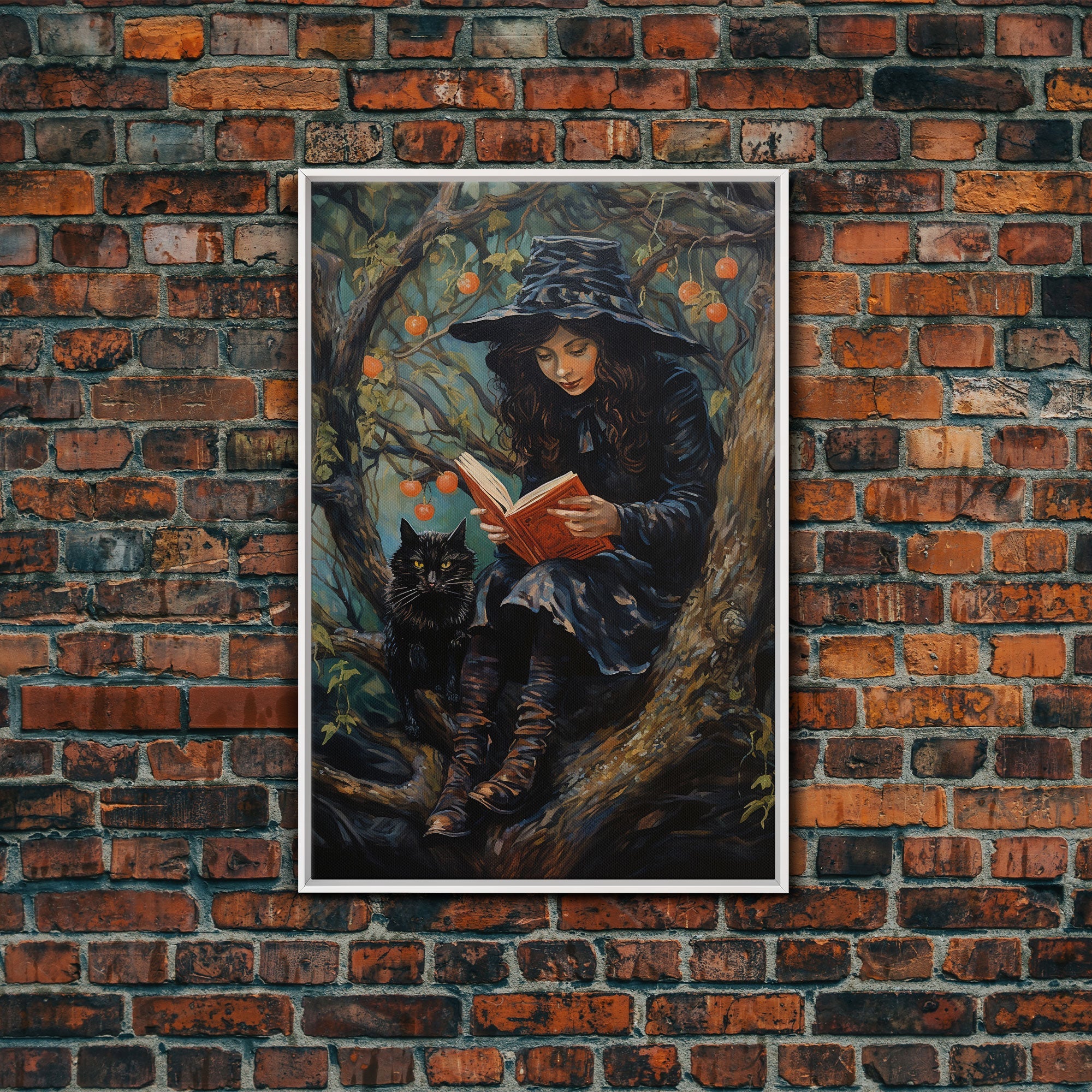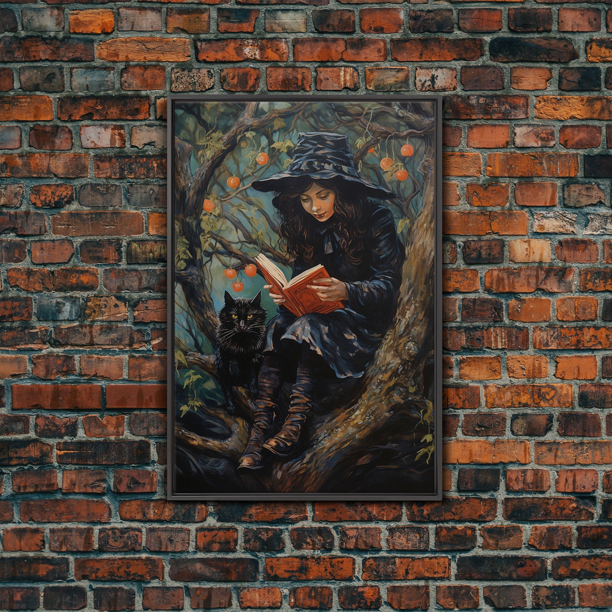 Cute Witch Reading Spells To Her Black Cat Familiar, Vintage Halloween Art, Framed Canvas Print, Halloween Canvas Art, Witchcraft