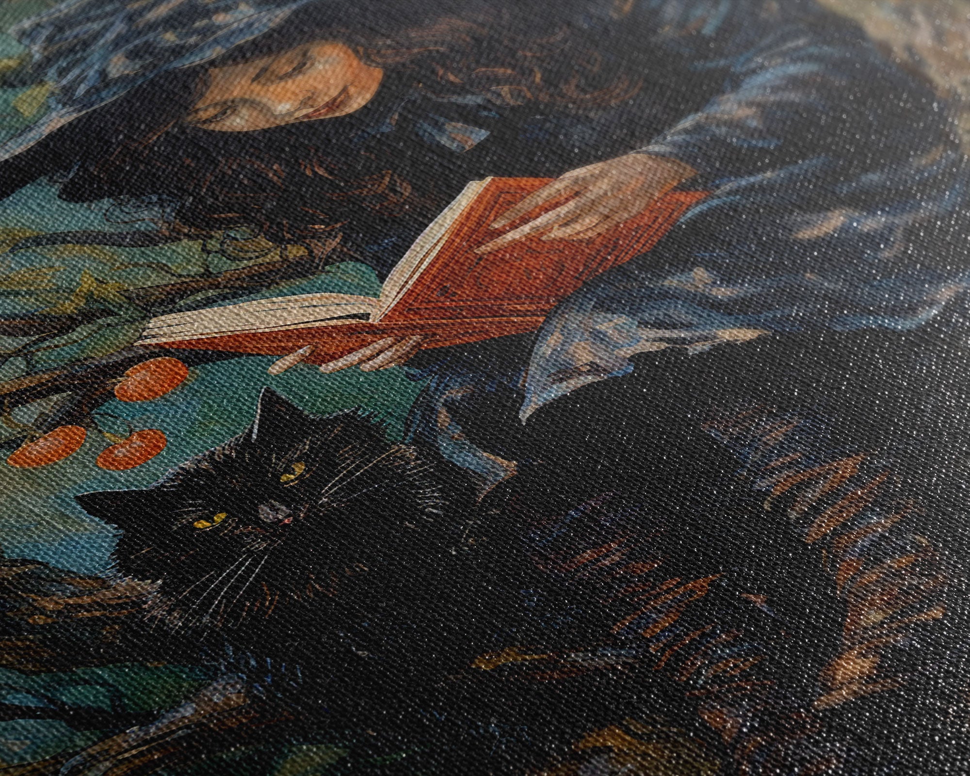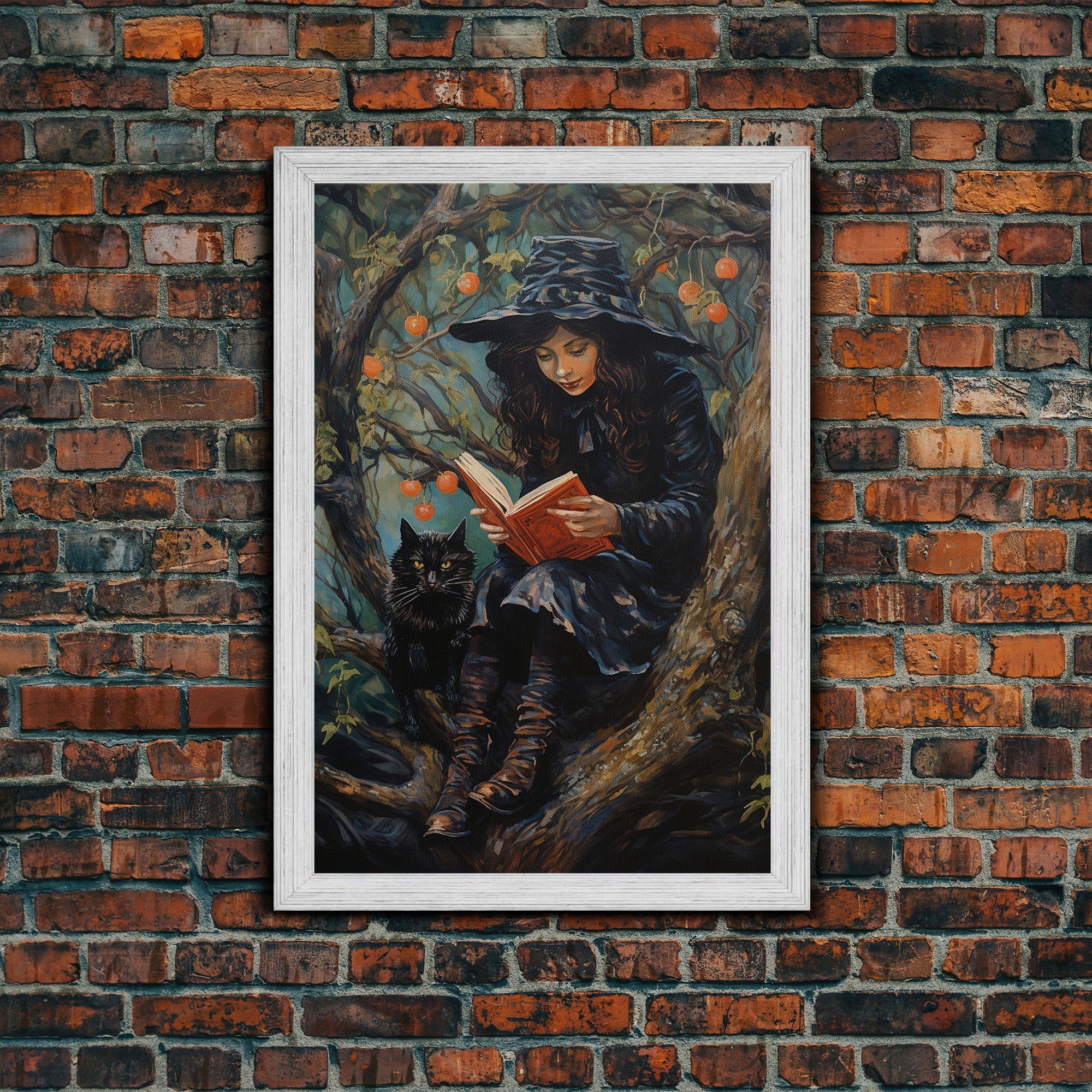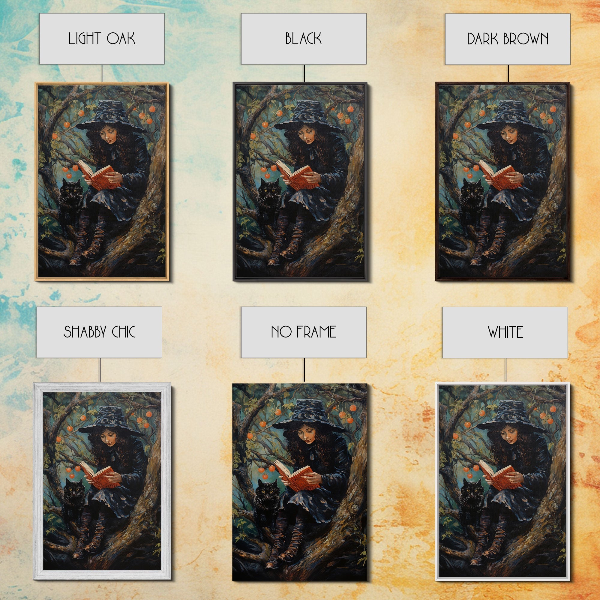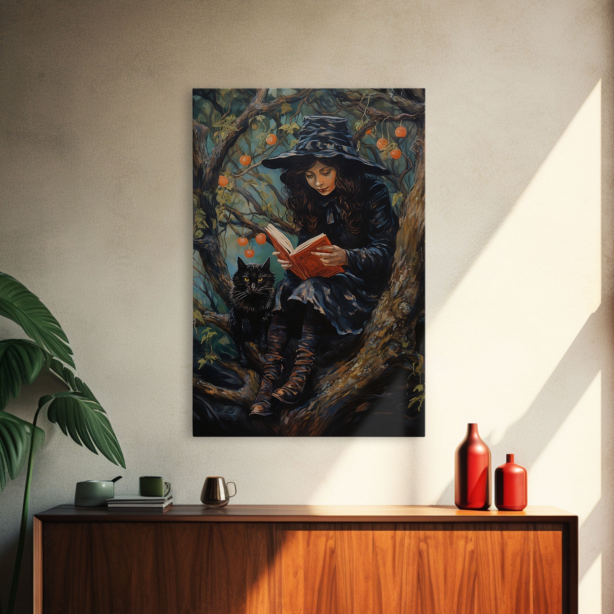 Cute Witch Reading Spells To Her Black Cat Familiar, Vintage Halloween Art, Framed Canvas Print, Halloween Canvas Art, Witchcraft
