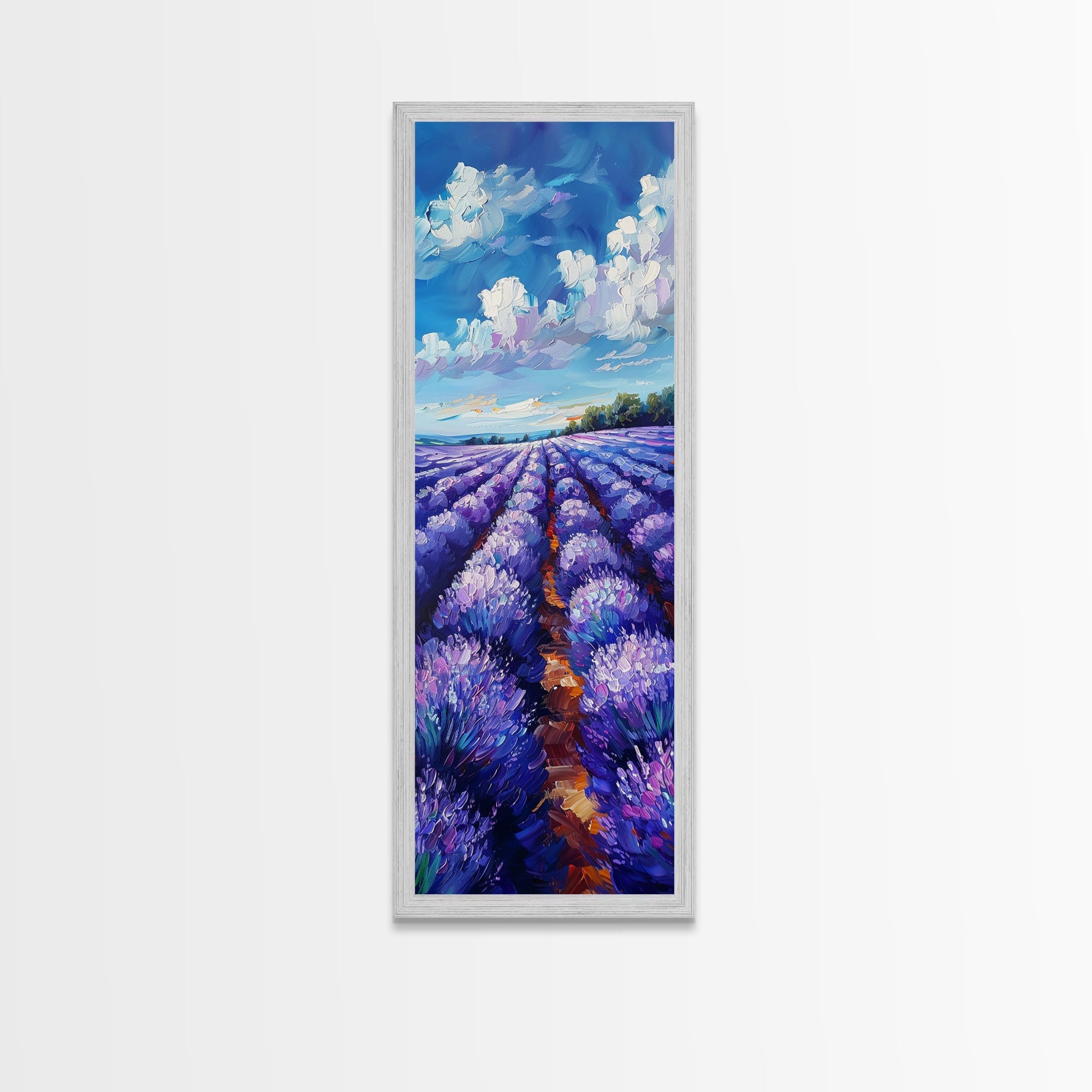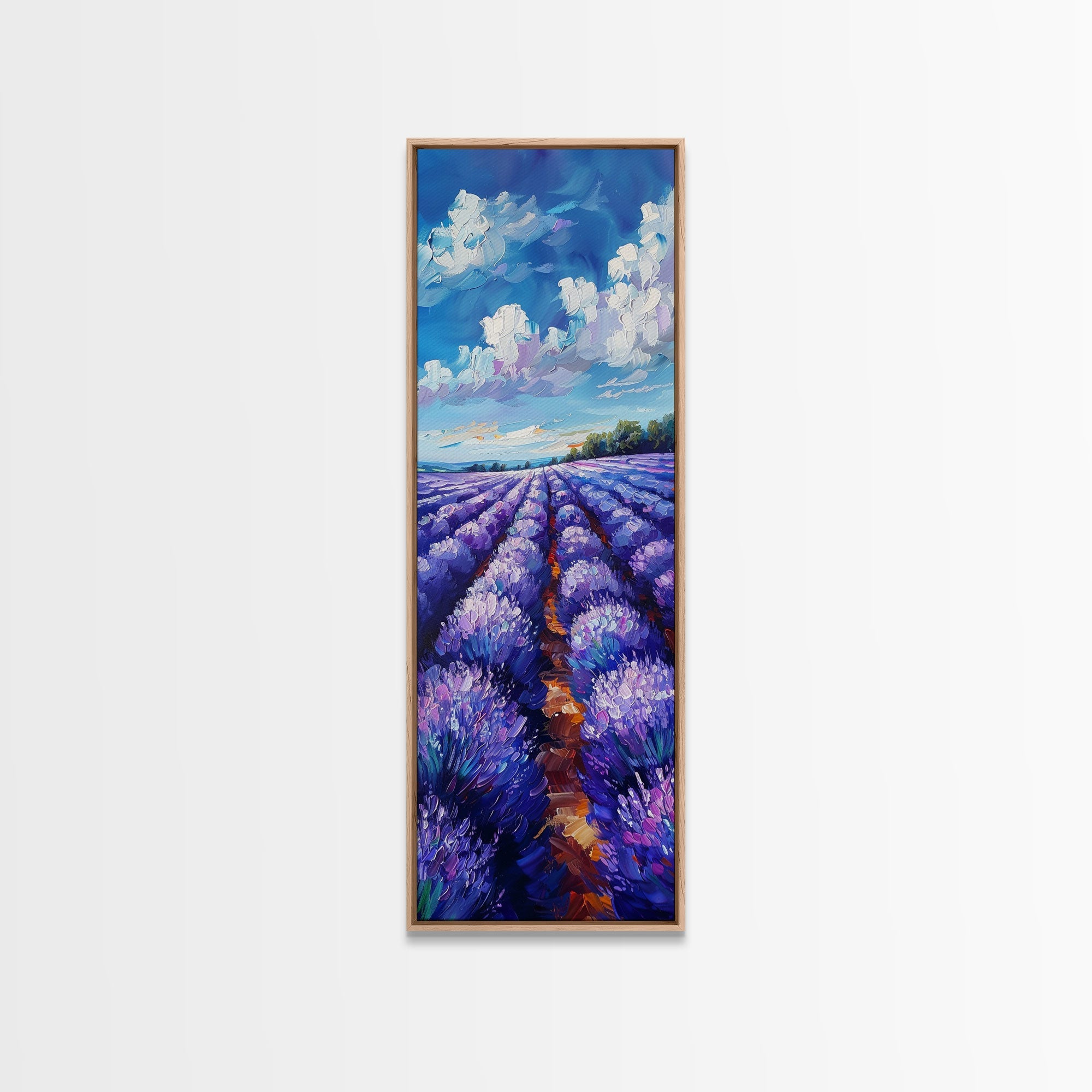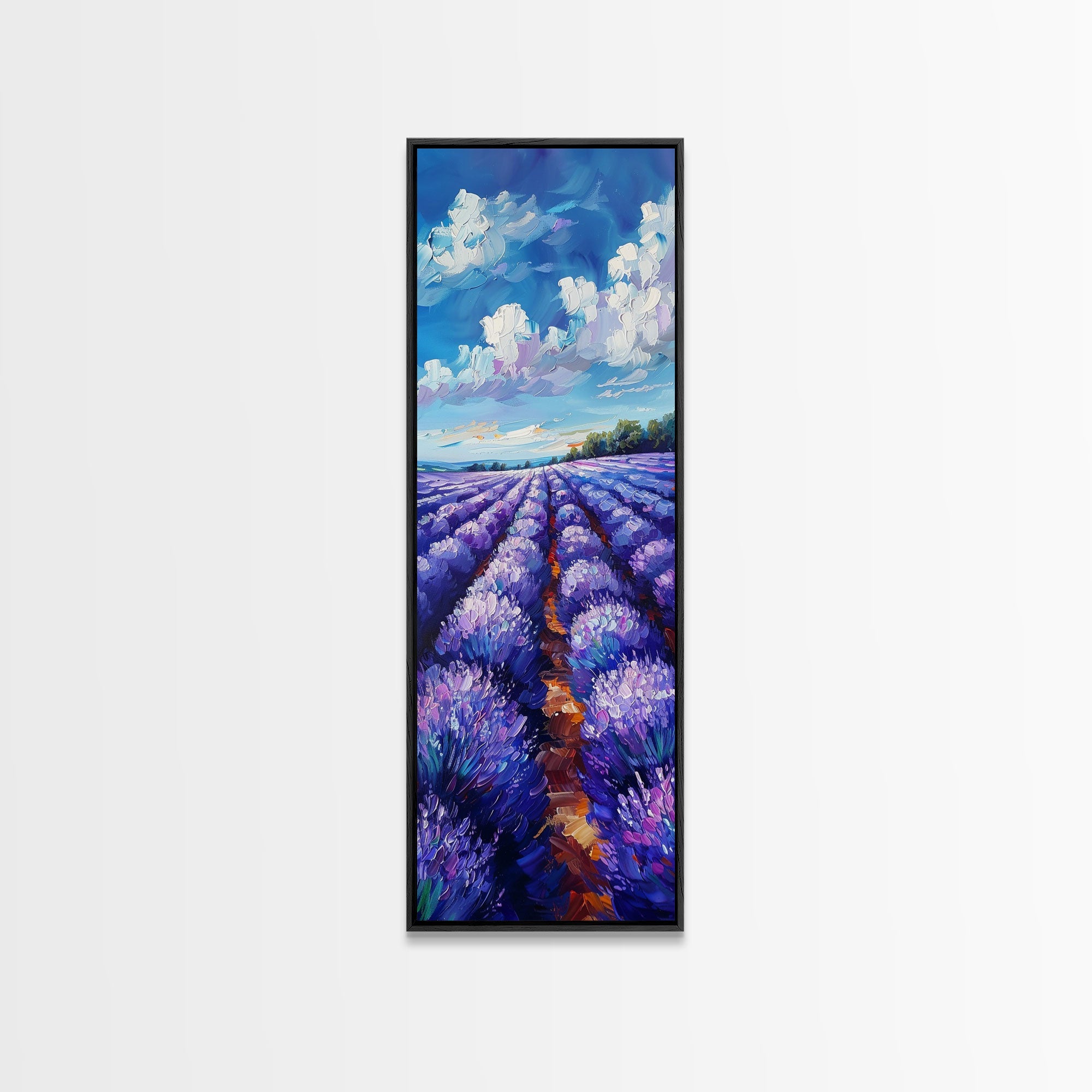 Expansive Lavender Fields Under a Bright Sky, Skinny and Tall Art, Bold Framed Canvas Print, Landscape Wall Art