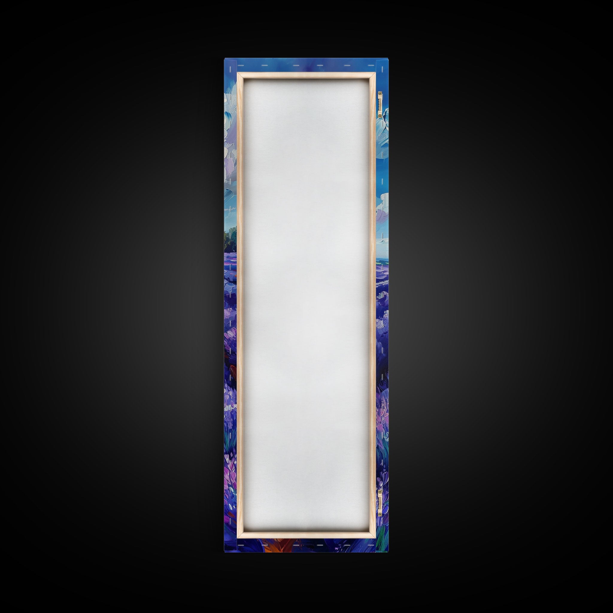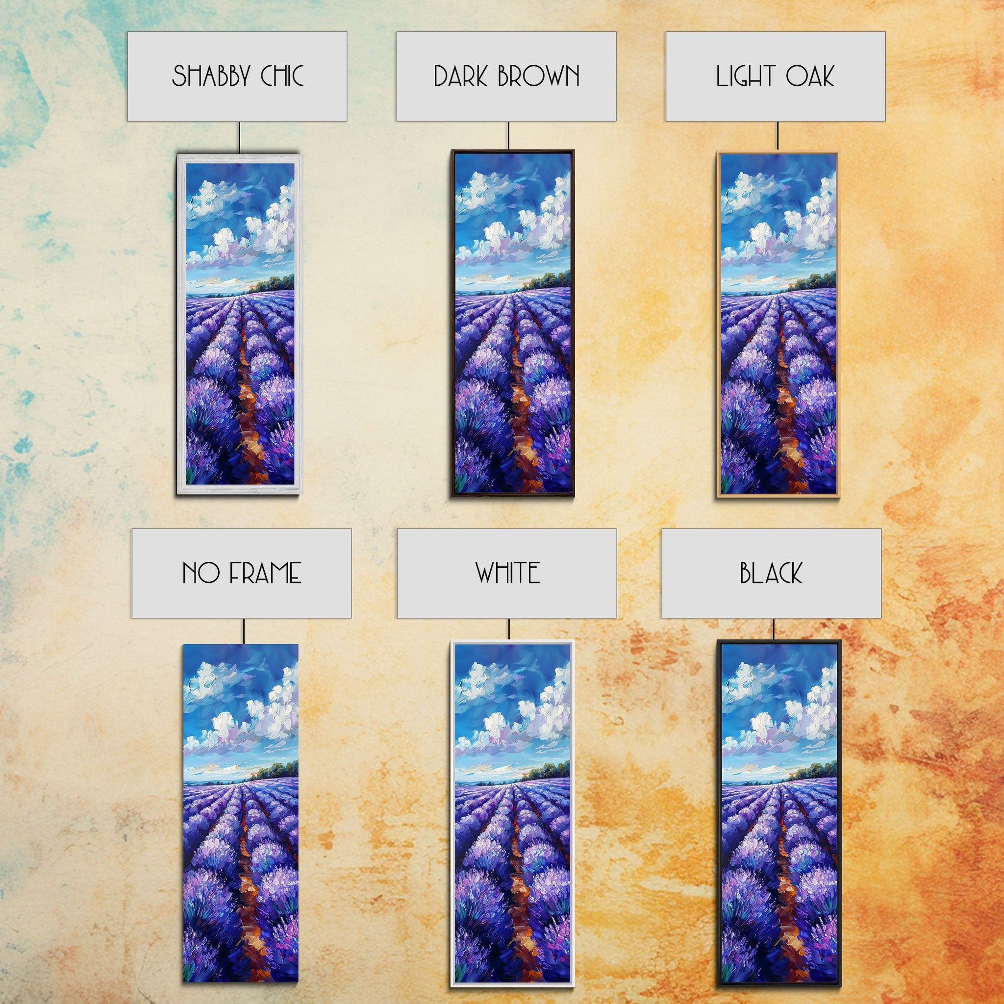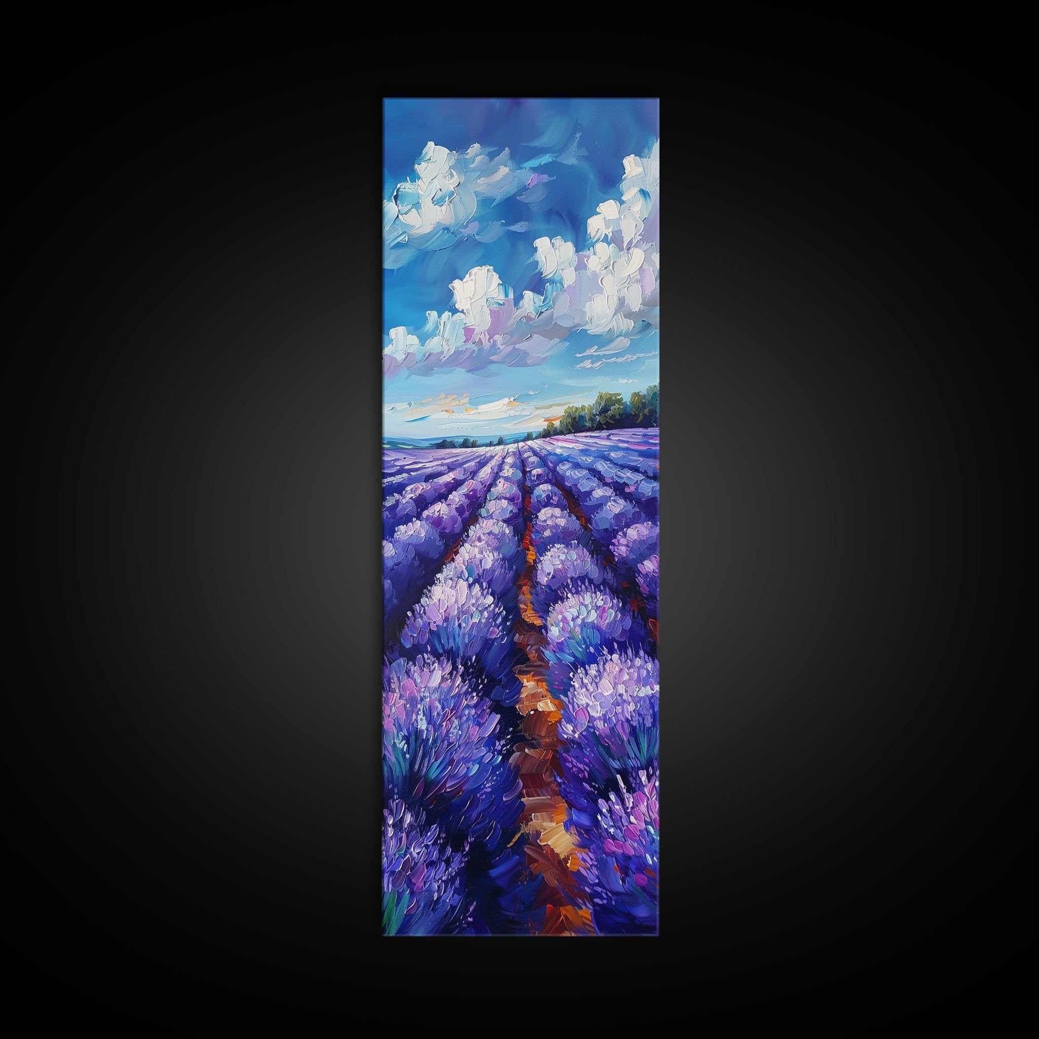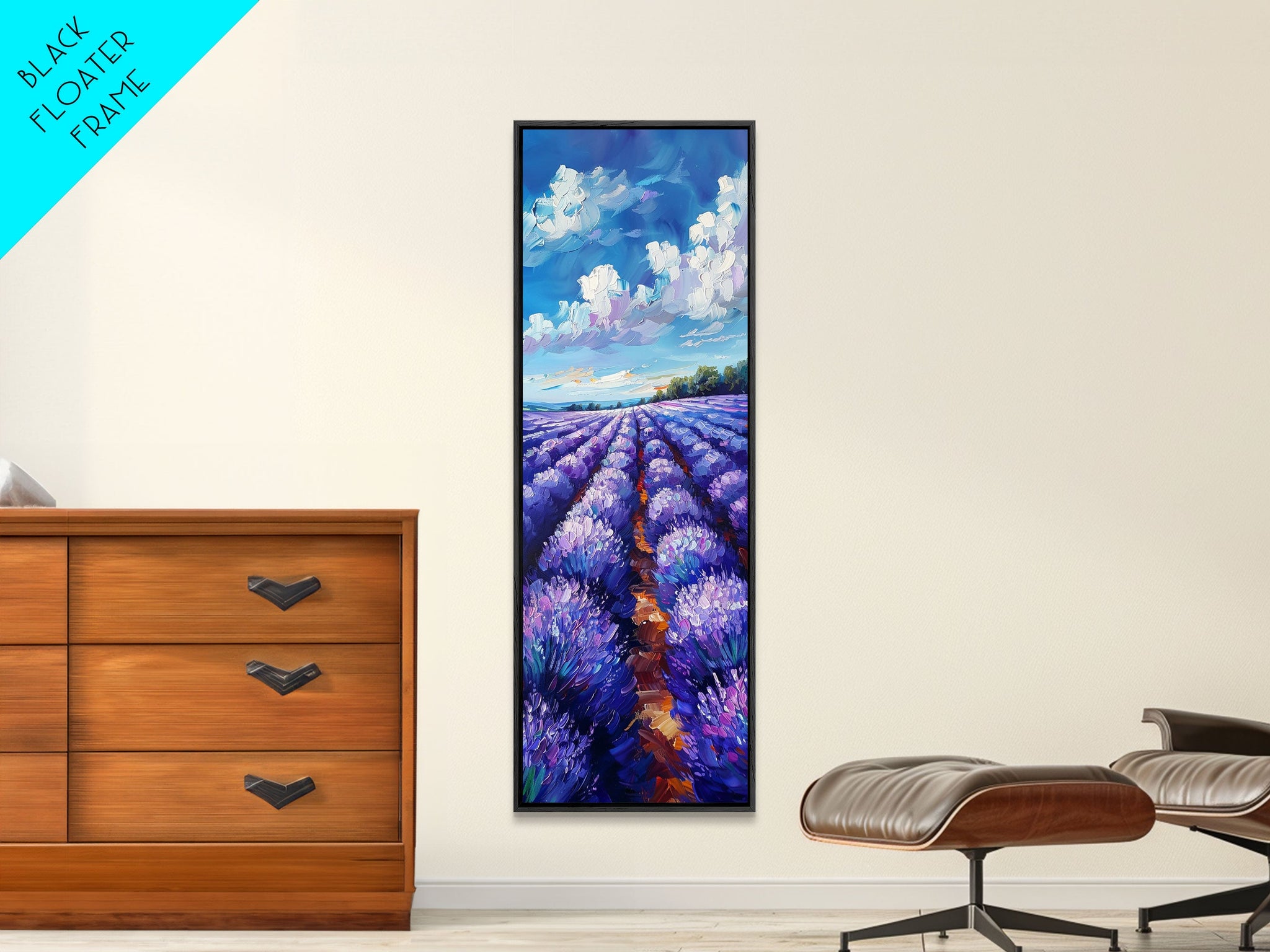 Expansive Lavender Fields Under a Bright Sky, Skinny and Tall Art, Bold Framed Canvas Print, Landscape Wall Art