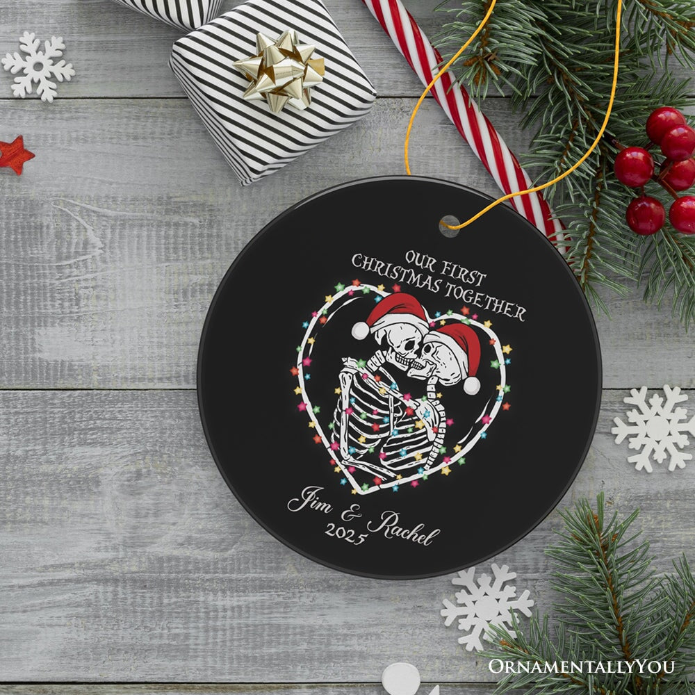 Celebrate your first Christmas together as a couple with our whimsical ornament! 👫🎄❤️ This enchanting keepsake captures the joy of this special milestone. With its playful design featuring two cute skeletons sharing a kiss under twinkling Christmas lights, it embodies the spirit of love and festive cheer. Personalize it with your names to make it even more special and cherished. Let's honor the start of a new tradition, the warmth of holiday moments as a loving pair. This ornament is a small token of the memories you're creating together. Let's celebrate your first Christmas as a couple, with love, laughter, and a touch of playful spirit! 🎁✨🎅
