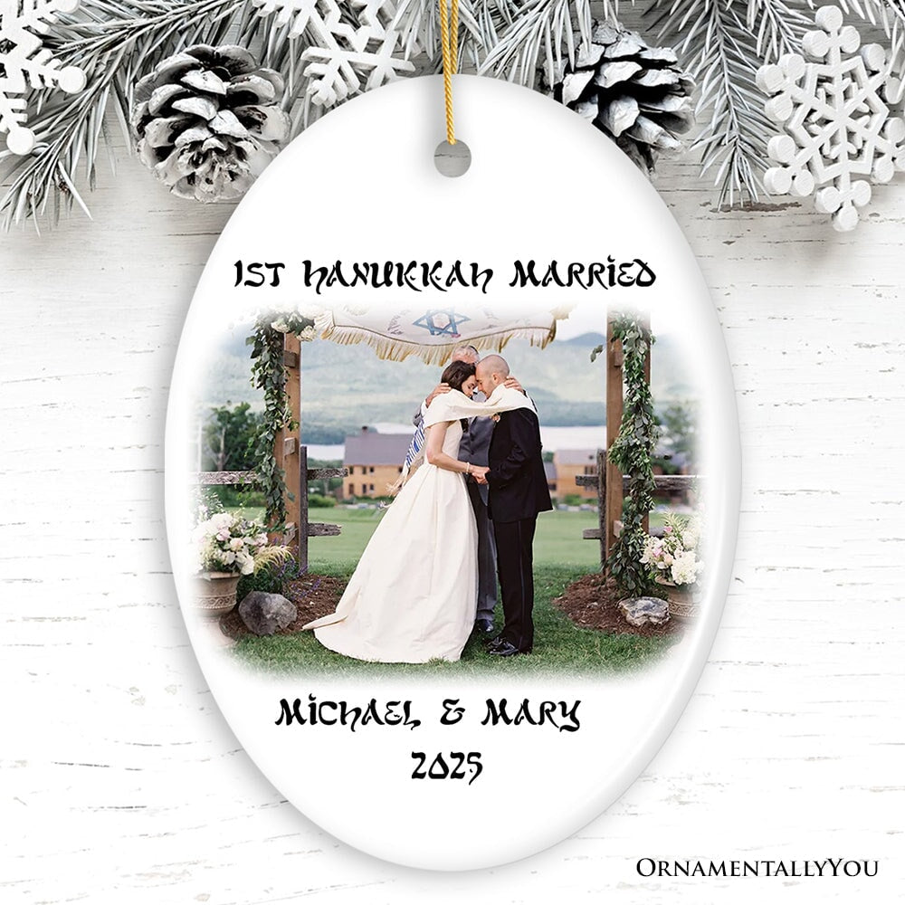 Celebrate the joyous occasion of your first Hanukkah as a married couple with our First Hanukkah Married Personalized Photo Ornaments. 🕎✨ This custom ornament allows you to showcase a cherished photo from your engagement or wedding, creating a beautiful keepsake to commemorate this special milestone in your lives. With the option to personalize it with your names and the year, this ornament becomes a meaningful addition to your holiday decor. Hang it on your Hanukkah bush or display it prominently in your home to share the love and happiness of your first Hanukkah together. Our First Hanukkah Married Personalized Photo Ornaments make a heartfelt engagement or wedding gift for newlyweds embarking on their journey of love and faith. 🕎✨