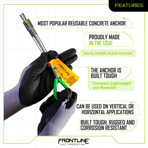 The Frontline reusable anchor bolt is our most popular anchor for concrete applications! The reusable anchor bolts are portable, easily installed and can be used in a variety of fall protection applications. Once the correct opening in the concrete is done, the reusable anchor bolt is then installed in a matter of seconds and can be conveniently used on vertical or horizontal applications. Its ease of use and functionality helps users install and relocate onto the next anchoring location quickly maintaining a good level of productivity while preserving the upmost safety compliance and user confidence.