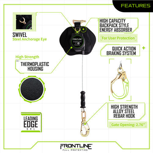 Are you working near or around falls that may occur over edges such as roofing, leading edges, steel applications, at foot level tie-offs 90 degrees of higher or other similar applications? Then the Frontline Leading Edge series are your go to solution in order to provide the best protection when exposed to such fall hazards. Conveniently use the Frontline Leading series whether on leading edge or non-leading edge applications, for a more diverse and maximum product usability. Manufactured to exceed expectations and tested by an independent third party ISO 17025:2017 accredited lab, these Leading Edge SRL’s are built rugged, built to last and built to give users the consumer confidence needed to perform their jobs with peace of mind when fall protection is required.