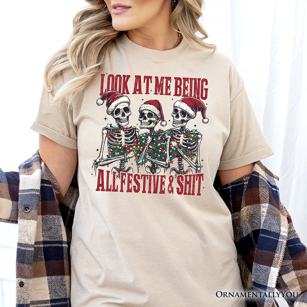 Get into the holiday spirit with a twist of humor in our Funny Skeletons in Santa Hat Christmas T-Shirt 🎅💀. Perfect for those who love a sarcastic touch to their seasonal wardrobe, this comfy unisex tee features a quirky skeleton wearing a festive Santa hat, paired with a witty "Look At Me Being All Festive" statement. Made from soft, breathable fabric, it’s ideal for casual winter gatherings, office parties, or lounging at home with hot cocoa ☕❄. A must-have for lovers of dark humor, edgy Christmas style, and anyone who prefers their holiday cheer with a side of sass. Great gift idea for friends, coworkers, or family members who enjoy a laugh during the holidays.