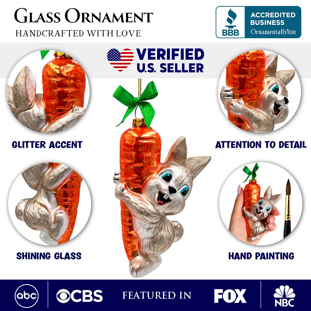 This whimsical glass ornament features an adorable bunny playfully hanging from a bright orange carrot, crafted with intricate hand-painted details and shimmering accents. Its glossy finish and vibrant colors add a cheerful touch to any holiday tree, while the lightweight design makes it easy to display. Perfect for kids, bunny lovers, or anyone who enjoys fun and unique decorations, this charming piece captures the joy of the season in a delightful farm-inspired style. A great gift idea for animal enthusiasts and collectors of playful Christmas ornaments.